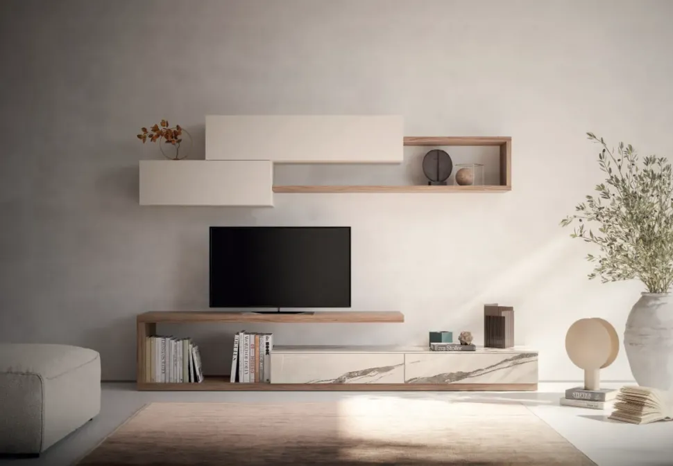 I mobili e complementi per la zona giorno danno la possibilità di personalizzare lo spazio creando particolari atmosfere: se vuoi un soggiorno design, la parete attrezzata in foto è l’ideale.