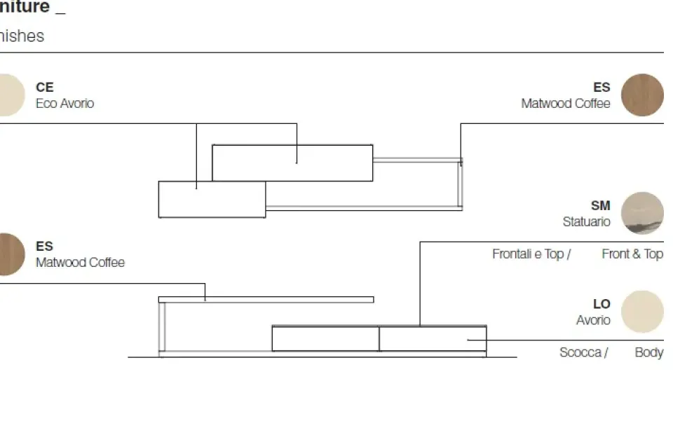 Soluzione proposta in Eco avorio, Matwood Coffee, statuario, avorio.