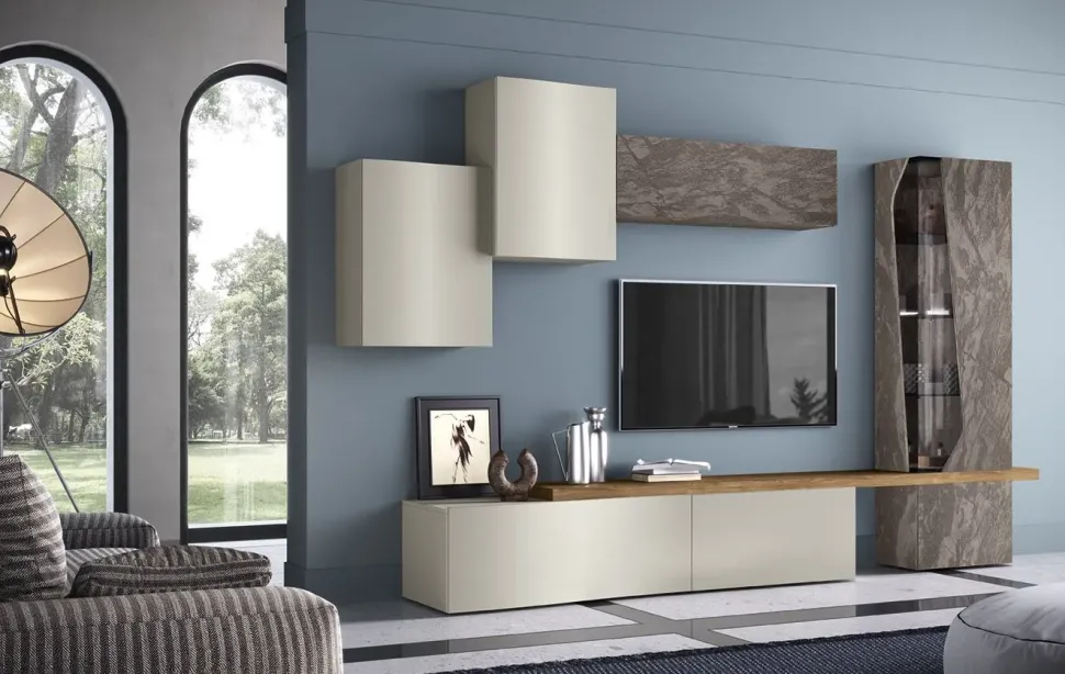 - Questa composizione per il living si rivelerà la scelta ideale se desideri una parete attrezzata push–pull dalle forme decise.