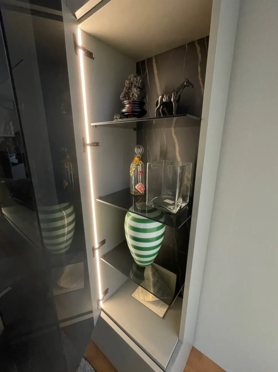 La composizione in expo: Vano portabiti,vano scarpiera, barre ledo, vano TV, libreria, vetrina. Materiale lamè fumo.