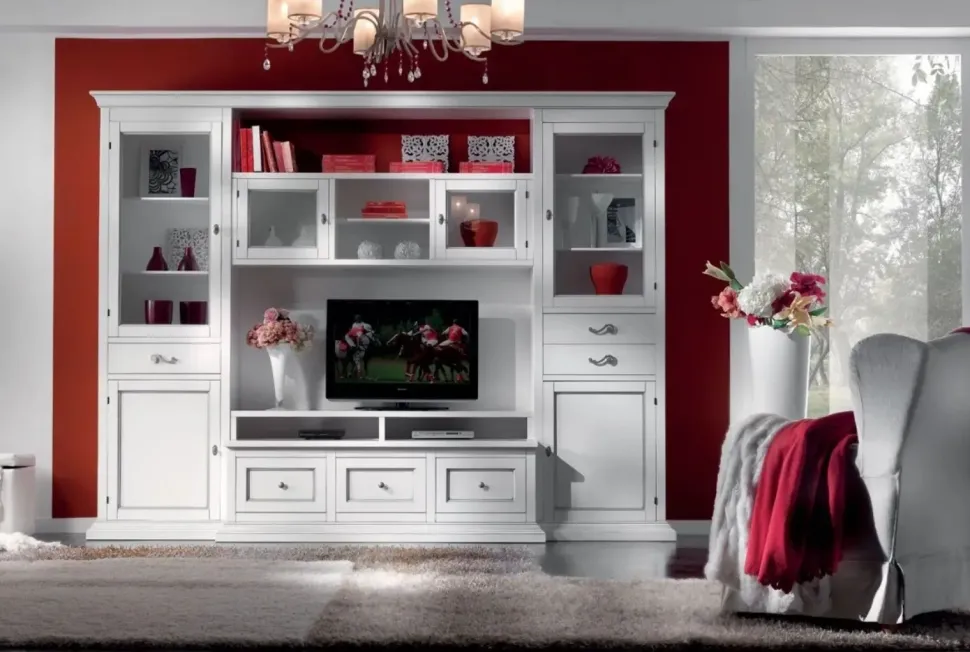 La parete attrezzata Living modello Cristina ha una larghezza che va da 251 a 300 cm ed è dunque ideale per locali di svariate volumetrie e forme.