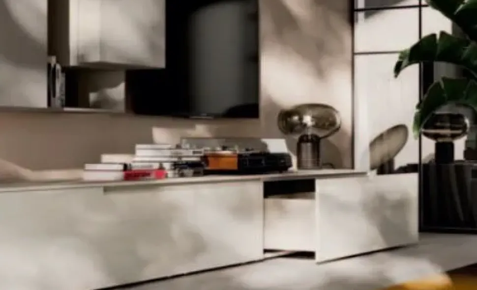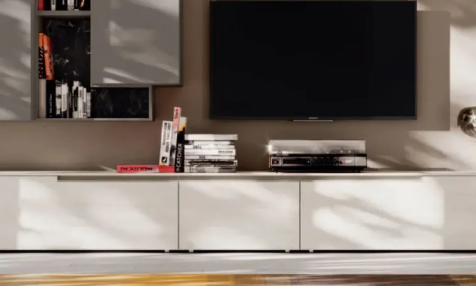 Per arricchire un living design prediligi una parete attrezzata che mantenga una certa coerenza stilistica, come questo modello Day 05 a prezzo ribassato.