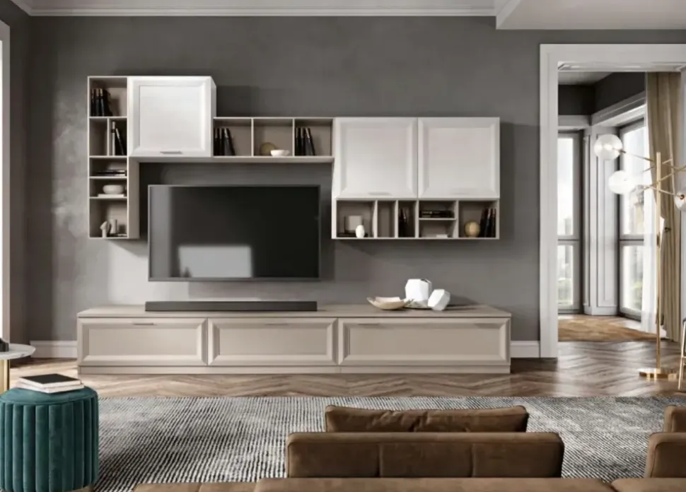 Per valorizzare un living design scegli una parete attrezzata che mantenga una certa coerenza stilistica, come questo modello J 108 a prezzo ribassato.