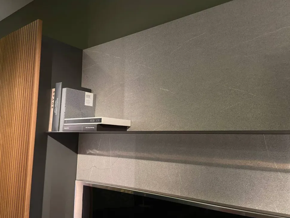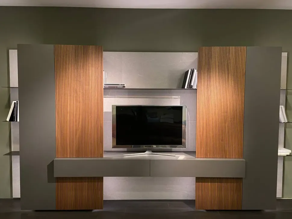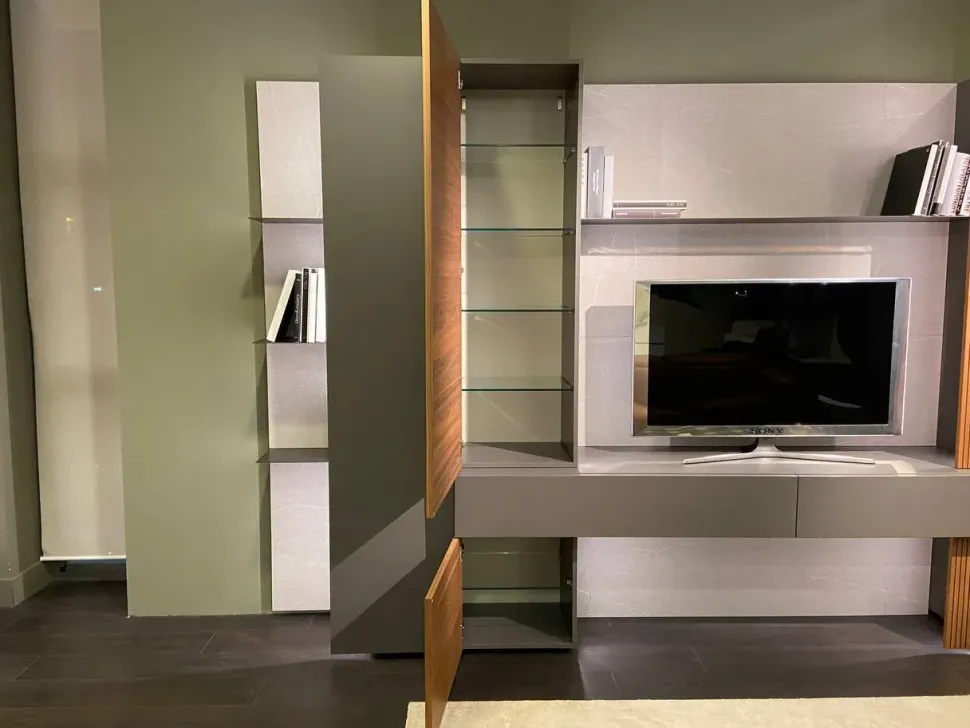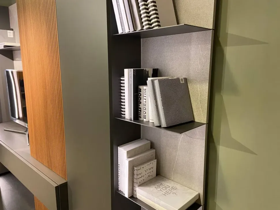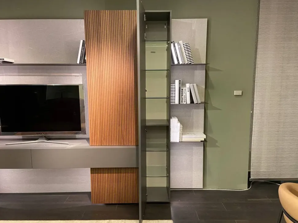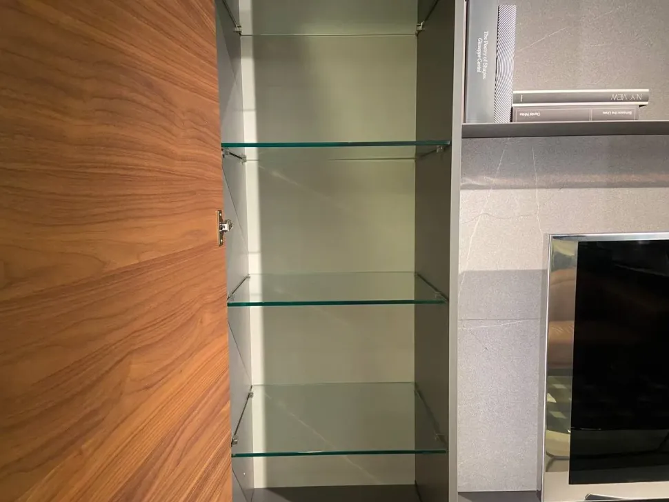 Schienali in nobilitato piasentina con mensole in metallo; Ante colonne e contenitori a ribalta col. piombo nobilitato liscio e groove col. noce naturale (030g); interni con mensole in vetro; luci LED incluse