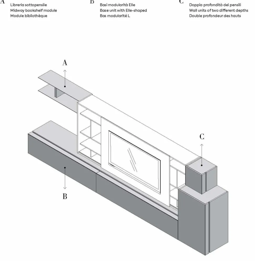 La doppia profondità dei pensili in sovrapposizione movimenta la composizione creando due piani d’appoggio distinti. La libreria sottopensile, coordinabile con tutti gli elementi della collezione, da vita a dei vani a giorno che danno carattere all arredo. Ad ogni spostamento del porta tv, si creano configurazioni nuove e personali. COLORI – Grigio cenere, Rovere tabacco DIM.- L. 3900 X P. 510 X H. 1700 . la composizione puo’ essre modificata dei colori e nelle misure del proprio ambiente.POSSIBILITA DI PAGAMENTO RAETIZZATO PERSONALIZZATO