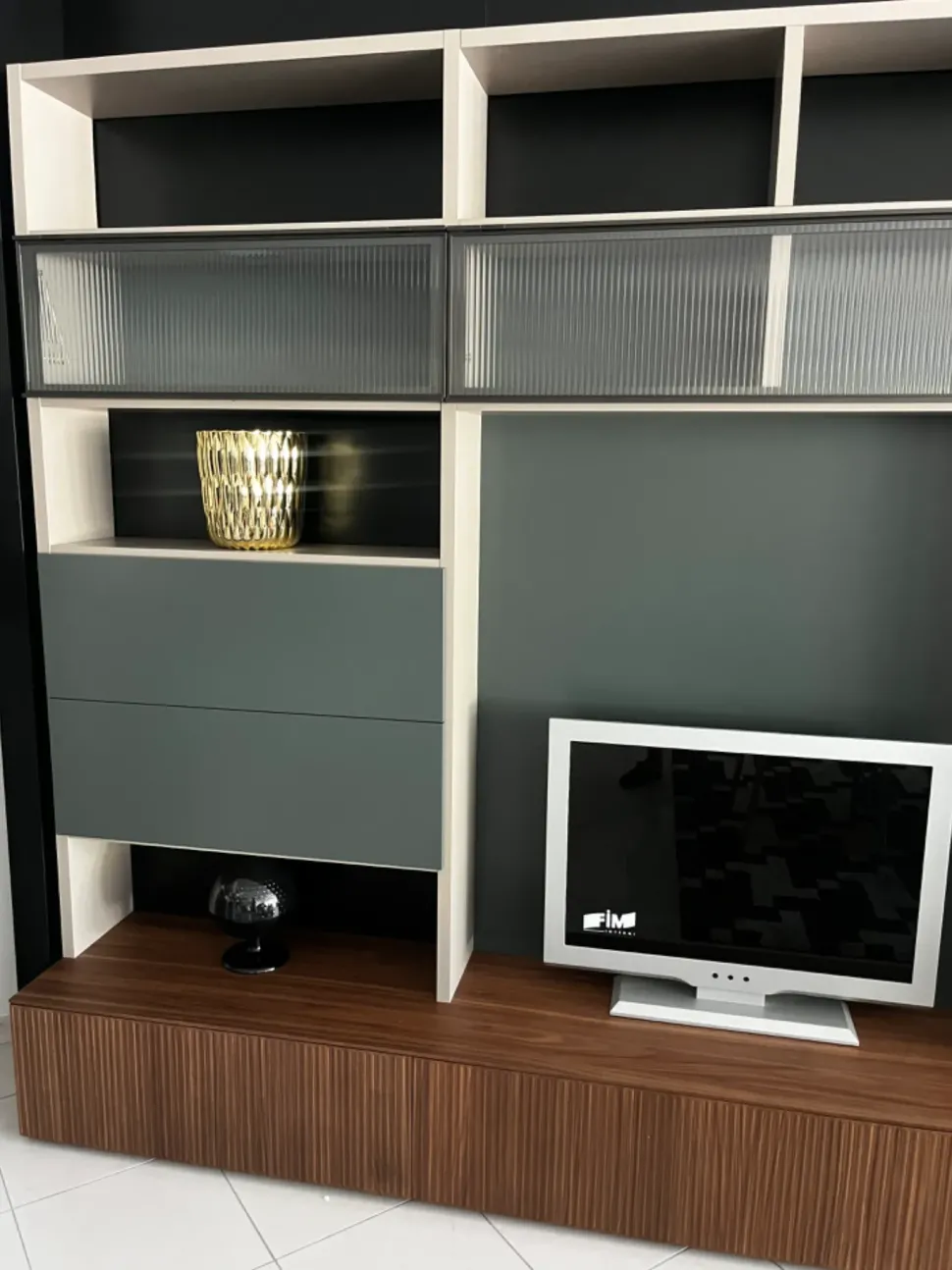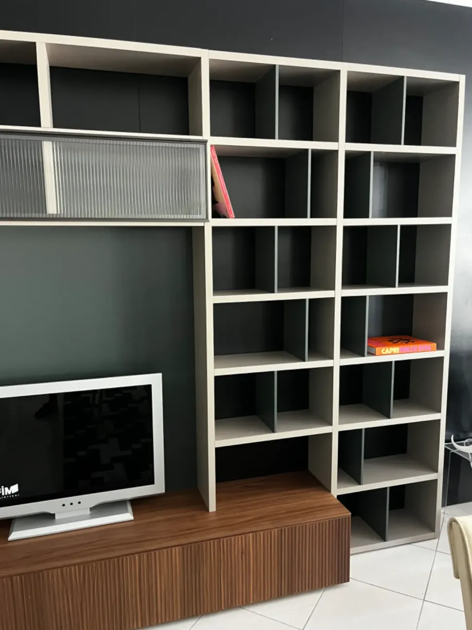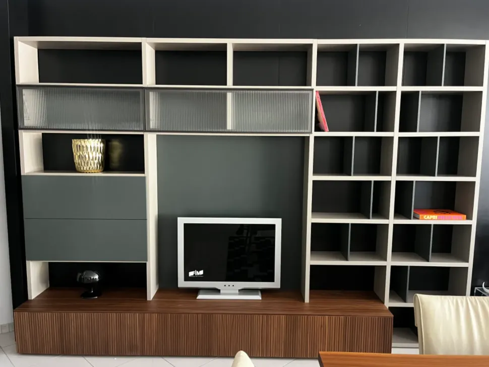 Parete TV attrezzata composta da vani contenimento e libreria. Ante vetrina effetto cannettato rays , che si ritrova sulle ante delle basi cestone con apertura Push pull, in finitura noce Canaletto. Elementi di contenimento con ante laccate opache. La libreria sulla destra presenta tramezze alternate che donano movimento ed eleganza alla struttura. Molto raffinato l accostamento del noce canaletto ai laccati opachi in colori tendenza. La vetrina rays regala luminosità e movimento.