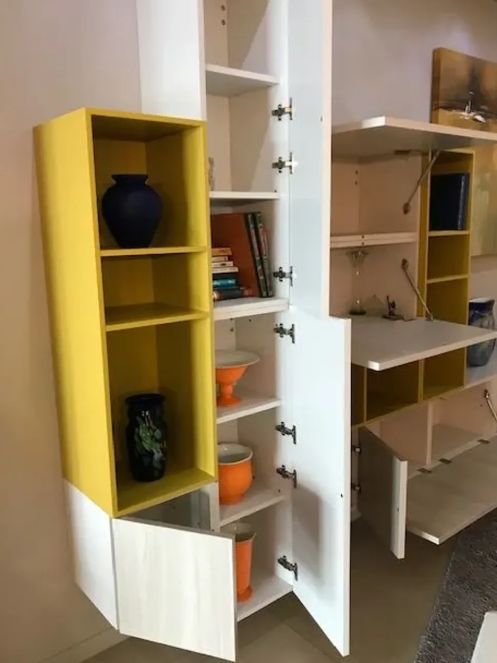 Replay di Villanova è un sistema integrato di spalla e contenitori da la possibilita ad ognuno di risolvere le proprie esigenze di organizzazione e di contenimento. Un interesse unico tra basi, pensili, fianchi e ripiani per una completa liberta compositiva. Composizione sospesa con elementi a giorno di colore giallo che contrastano con i cubi bianchi e le basi in olmo naturale, tutte le aperture sono push pull (vedi foto) larghezza totale 318, ingombro in profondita 50 cm.