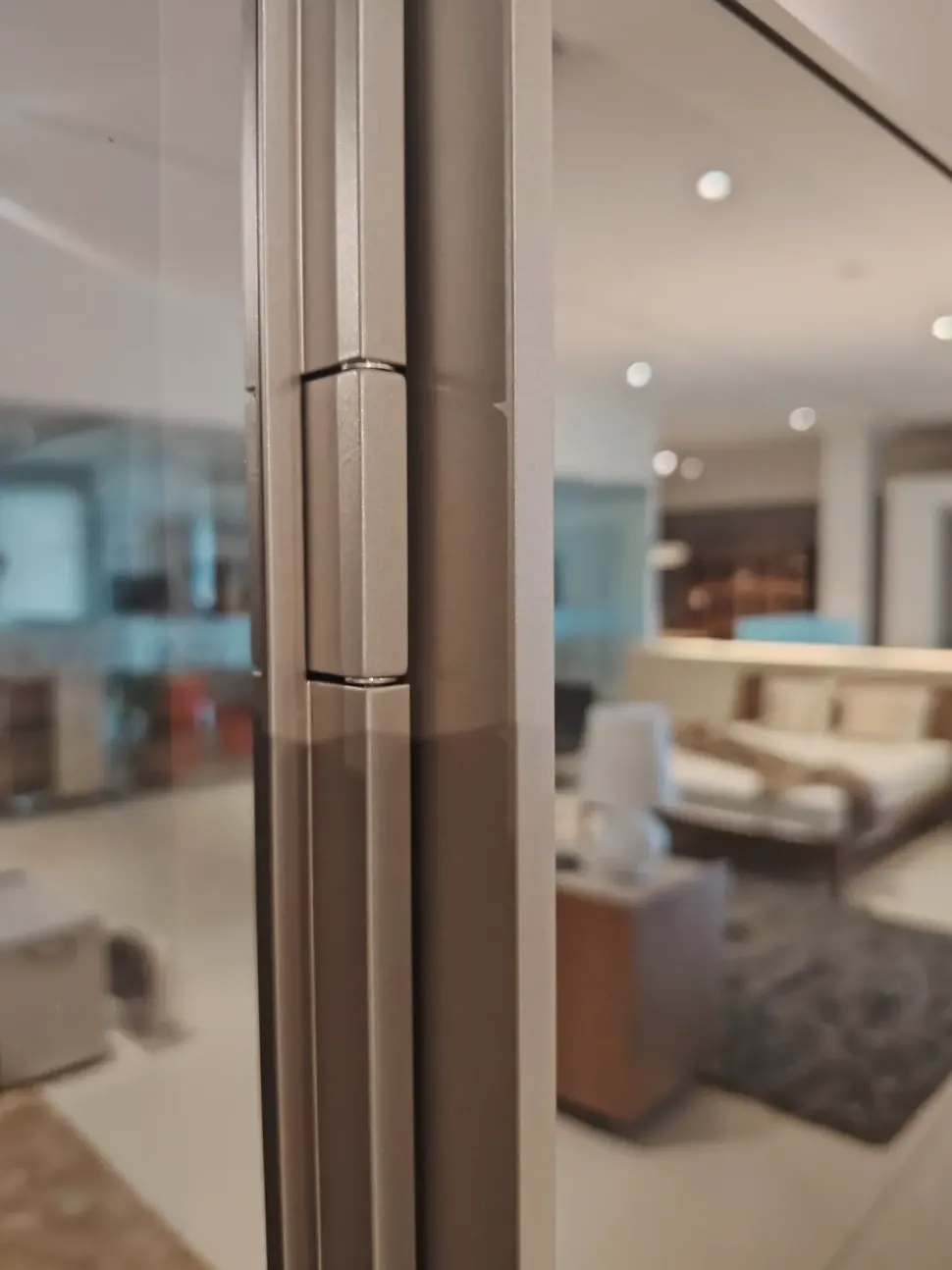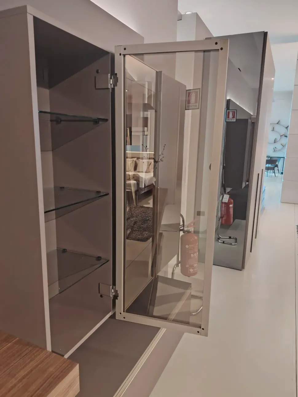 Composizione soggiorno Spazio di Pianca, con finitura laccato opaco color Fango, piano in noce Canaletto, mensole in metallo finitura Champagne, vetrine con telaio metallo e vetro bronzo.