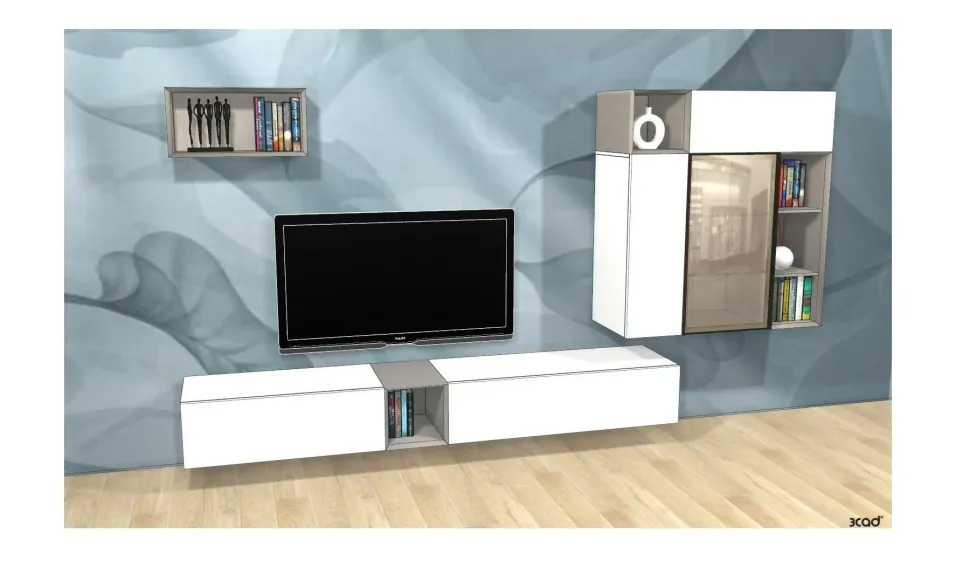 Colori moduli a giorno laccati opachi seta, moduli ad ante meterico bianco opaco e modulo vetrina con vetro riflettente bronzato.