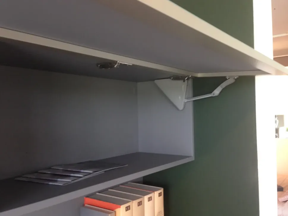 Il pensile è lungo cm 180 ed ha l’anta in vetro acidato montata su telaio in alluminio. Sotto il pensile è montata una mensola lucida con pannello opaco.