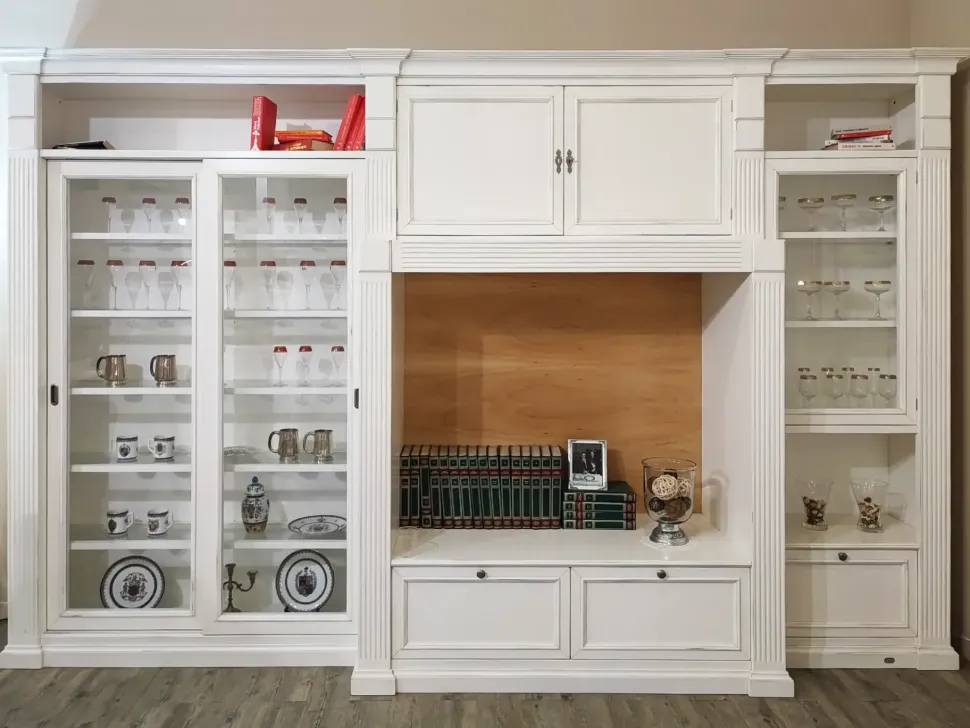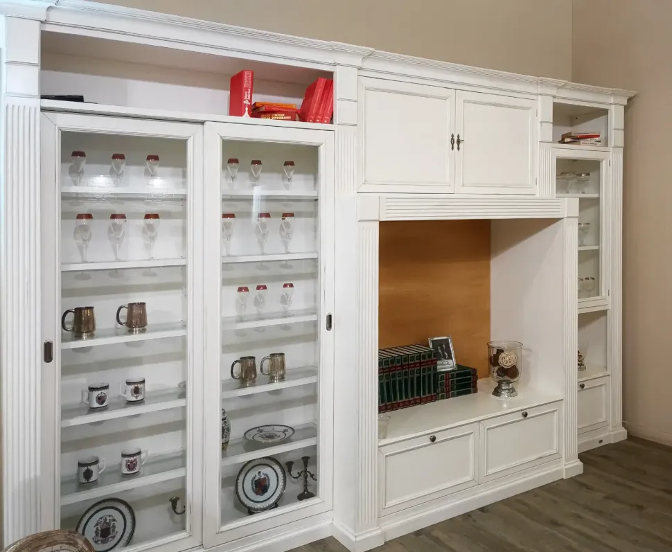 Finitura: laccato bianco anticato con vetrina a sx 2 ante scorrevoli e faretti interni