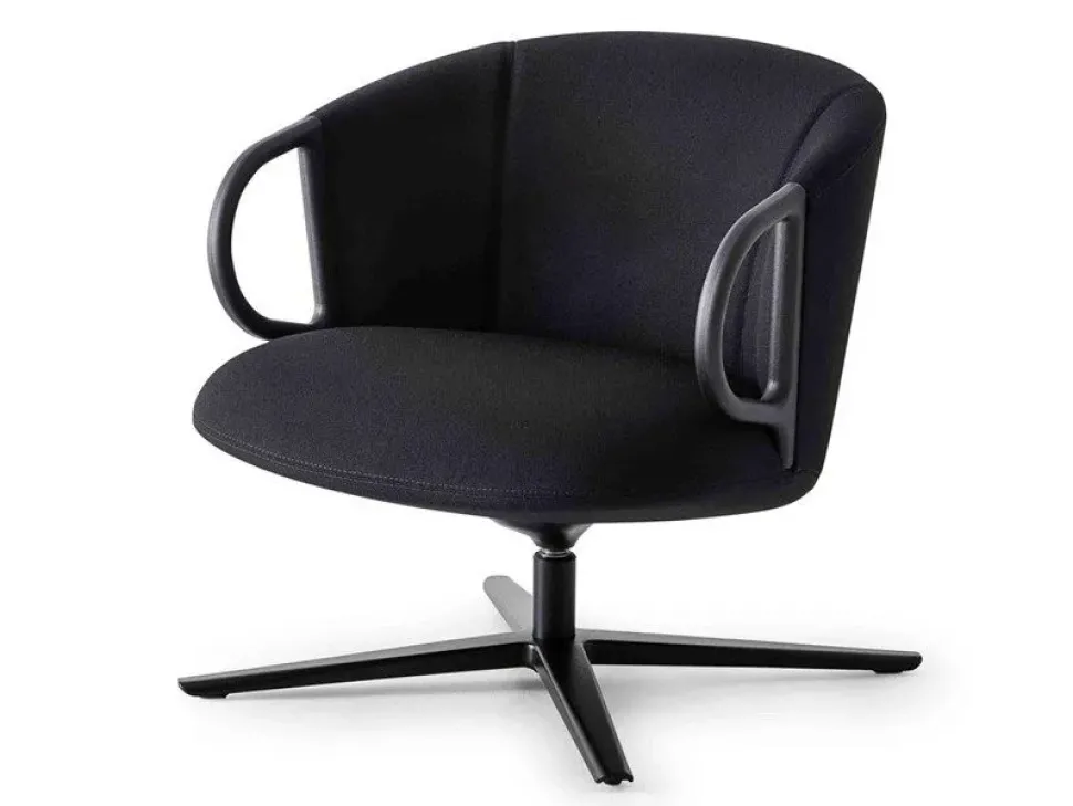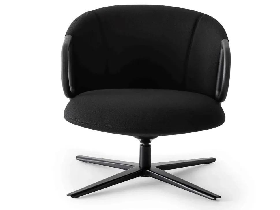 Cucaracha LB è una poltroncina girevole con un basamento a 4 razze in alluminio color nero. Il rivestimento in tessuto è piacevole sia visivamente che al tatto.