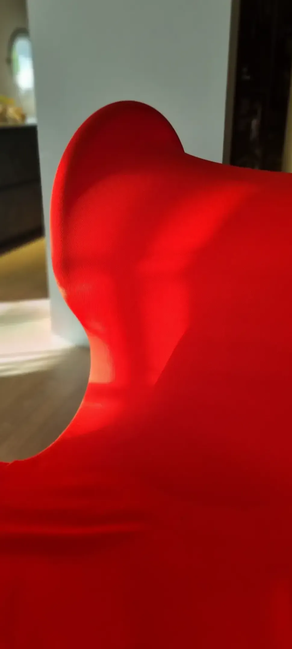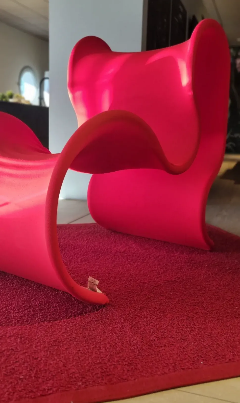 La poltrona Fiocco è costituita da una struttura in tubolare metallico curvato rivestita da una calza in tessuto bielastico rosso facilmente sfoderabile.