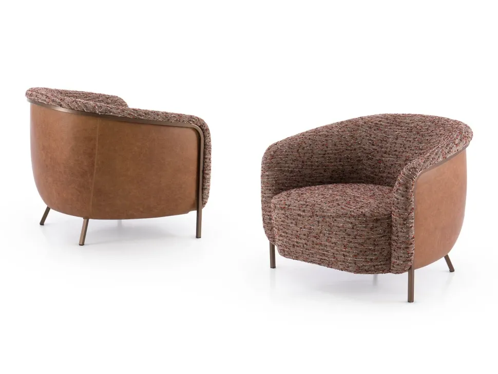 Un profilo portante in metallo finitura bronzo, dalla sezione quadrata, definisce i piedini anteriori e prosegue lungo i braccioli per poi avvolgere lo schienale curvato, enfatizzandone le linee fluide e contemporanee.