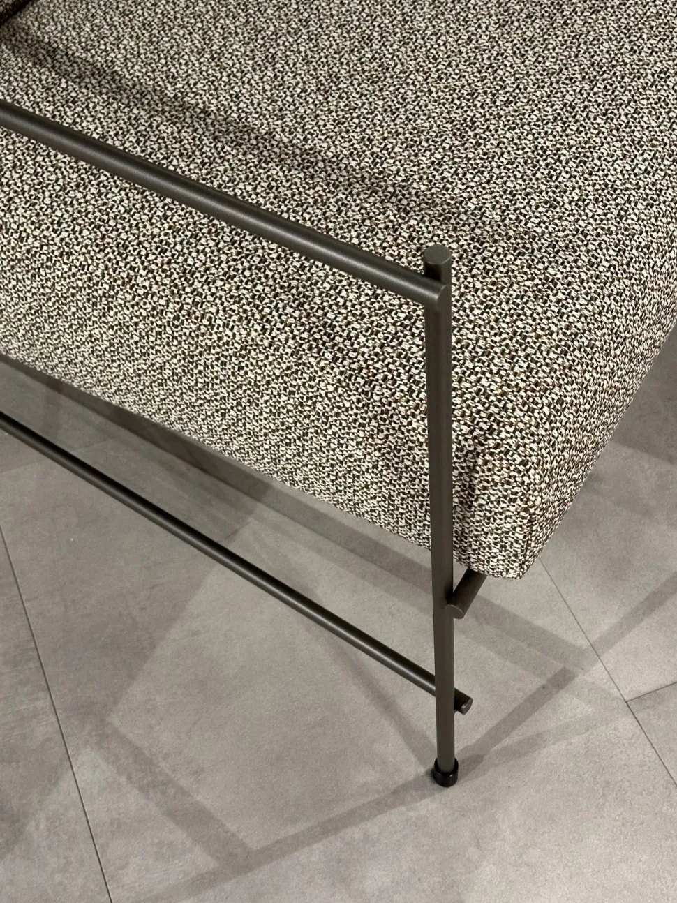 POLTRONA DAL DESIGN UNICO CON STRUTTURA IN TONDINO DI METALLO VERNICIATA LIGHT BROWN, SEDUTA IN TECNOFORM RIVESTITA IN TESSUTO TRAMATO. MISURA CM.77 P88 H79