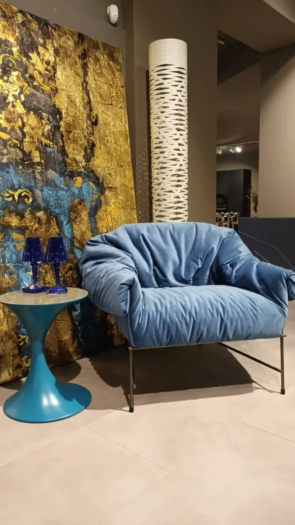 Poltrona di design rivestita in tessuto e struttura tubolare.