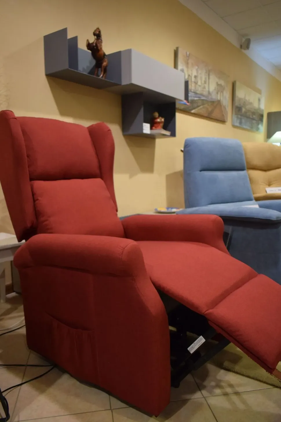 La struttura della poltrona è in legno massello di abete, tale da permettere la massima stabilità della poltrona nell’alzata e resistenza a pesi elevati. Una struttura in ferro motorizzata viene utilizzata per unire seduta, braccioli, e schienale della poltrona. Le parti esterne della poltrona sono imbottiti con schiuma di poliuretano espanso, rivestimento esterno a scelta in tessuto o ecopelle. Le dimensioni: larghezza 76 cm. Profondità 90 cm. Profondità aperta 160 cm. Altezza del schienale 104 cm. La nostra offerta per la poltrona è di euro 600,00. Per maggiori informazioni o preventivi contattaci via mail o passa nel nostro showroom.