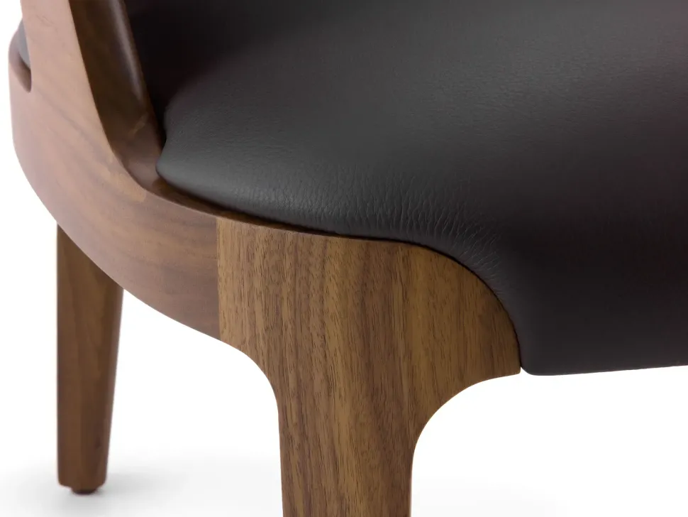 Il tratto distintivo di questa poltrona è la pregiata lavorazione artigianale della struttura in legno di noce canaletto, che unisce in modo armonioso i volumi di seduta e schienale. I braccioli, lo schienale e la seduta, imbottiti con poliuretano espanso ignifugo, sono rivestiti con una pelle pieno fiore a grana naturale, proposta in una sofisticata tonalità testa di moro.