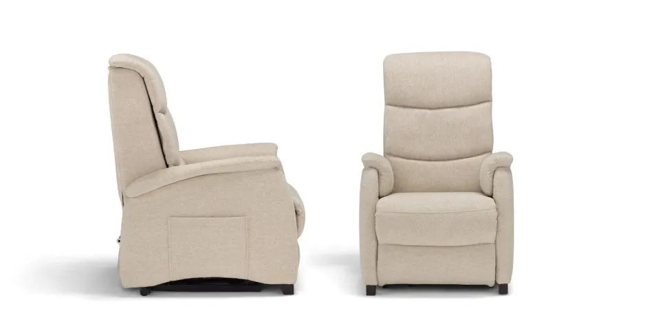 Poltrona Lift-Relax realizzata con meccanismo motorizzato. La struttura solida è assemblata con parti esterne e interne in agglomerato di legno (multistrato e massello di legno) ricoperta da poliuretano espanso indeformabile.Non sfoderabile. Piedi in legno.