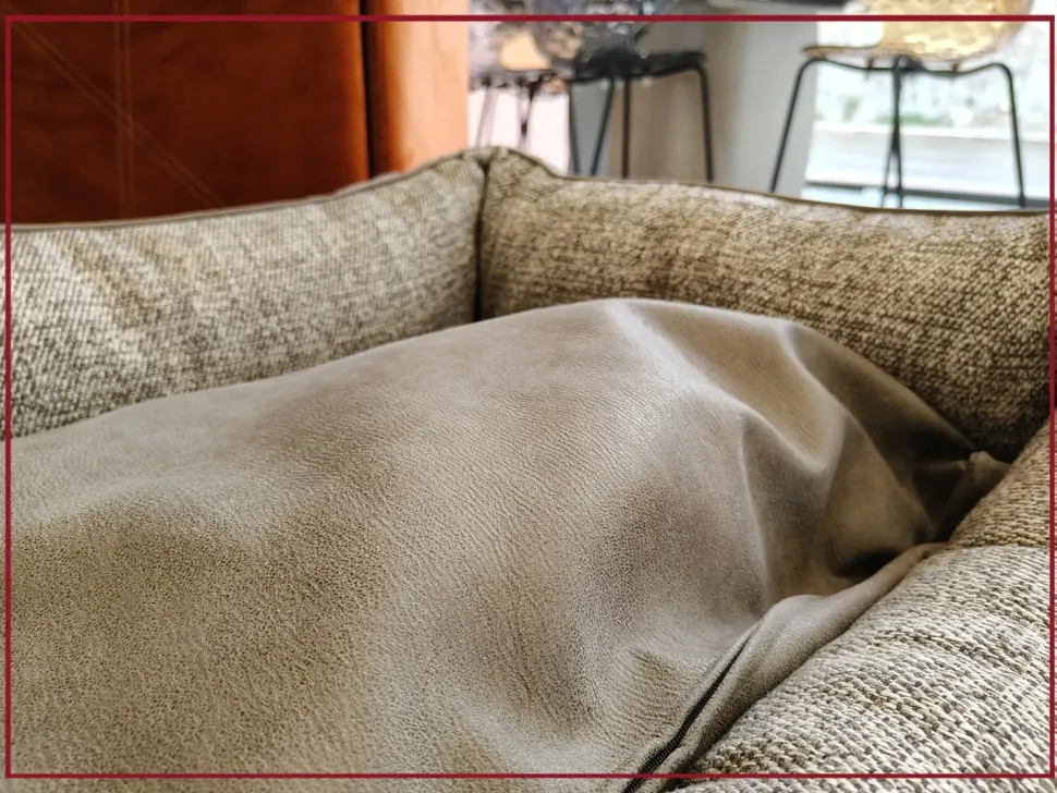 Il design esclusivo si distingue per il bordino a contrasto che segue con precisione il profilo della cuccia, aggiungendo un tocco di personalità e raffinatezza. Il cuscino interno sfoderabile e imbottito in fiocco, regalerà un angolo di puro relax al tuo animale