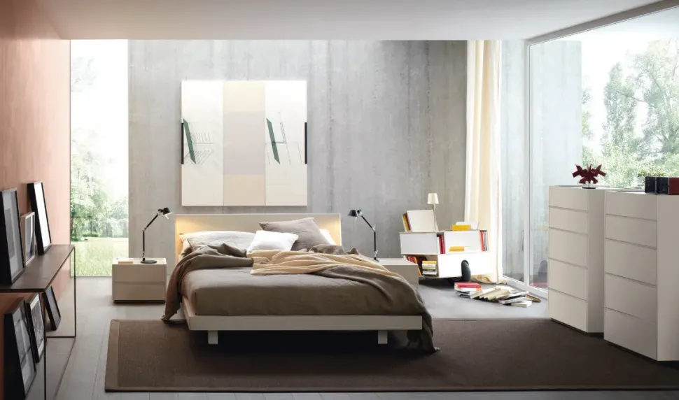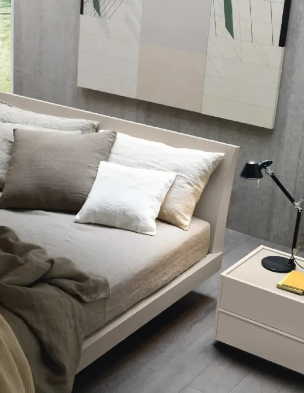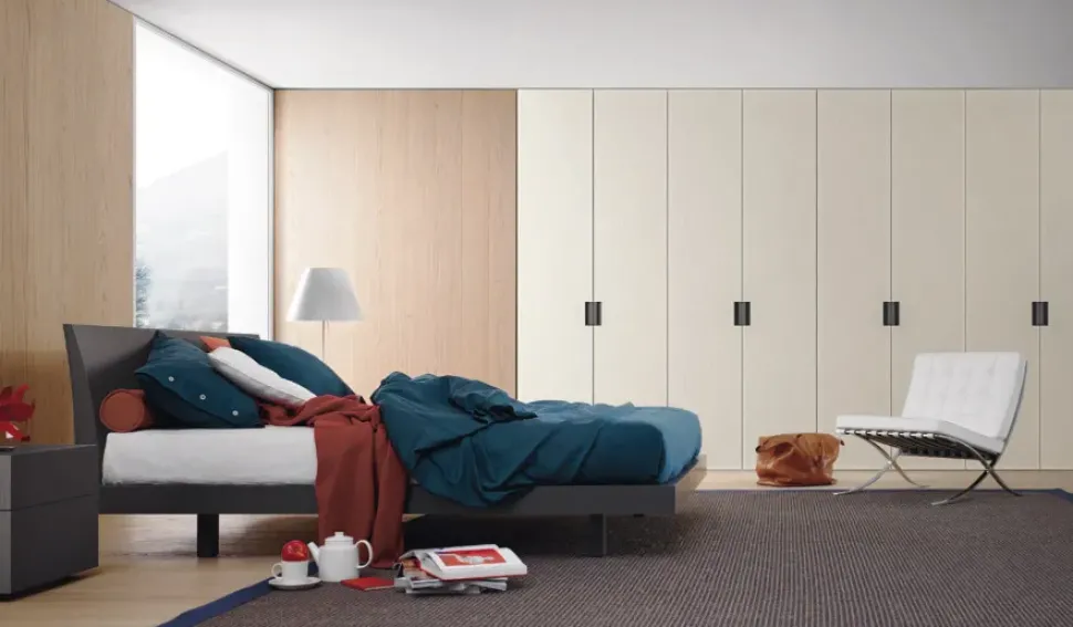 Brio è un letto matrimoniale di design. La robustezza di questo letto è data principalmente dalla testiera, il cui generoso spessore visibile anche frontalmente grazie alla sua inclinazione. E’ rivestito da uno strato di frassinato sintetico che offre resistenza agli urti e al tempo.