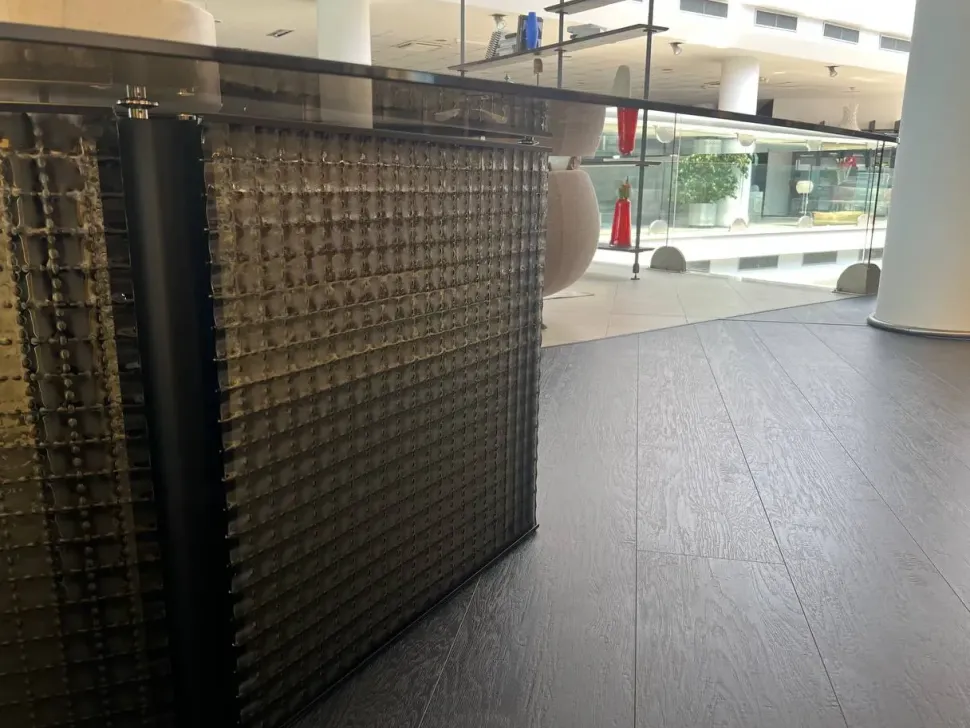 Piano a botte con angoli smussati in vetro bronzo e basamento trapezoidale in vetro fuso T-Squares in vetro bronzo.