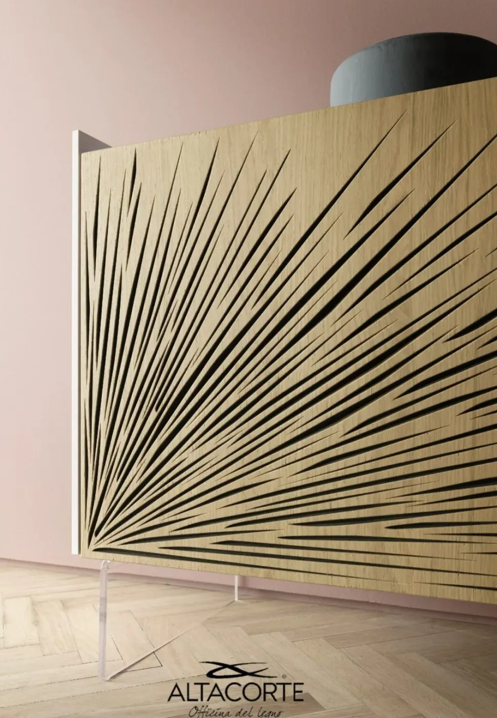 Disponibile in molteplici finiture. Una credenza dalla linea moderna dal design ricercato ispirata al movimento delle spighe di grano mosse del vento. Disponibile in diverse versioni e con tre tipologie di staffe diverse