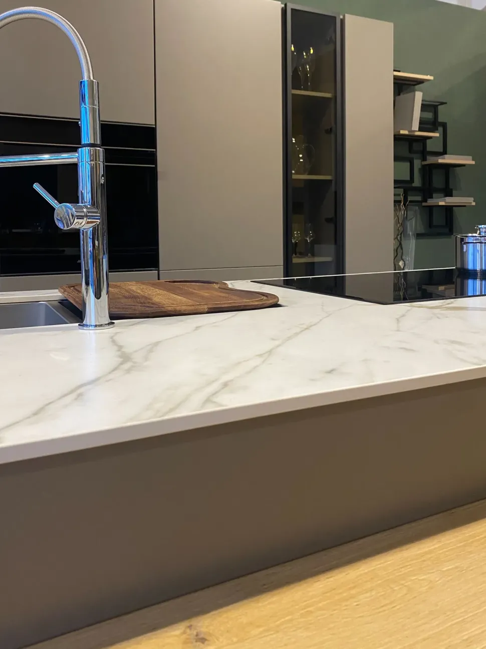 - Materiale laccato opaco, stile moderno e colore tortora, con disposizione ad isola.