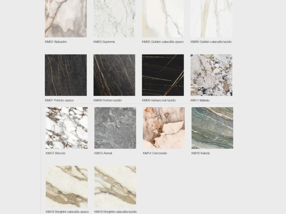 Piano in ceramica Marmi nei colori Alabastro (KM02), Supreme (KM03), Golden Calacatta opaco (KM05), Golden Calacatta lucido (KM06), Portoro opaco (KM07), Portoro lucido (KM08), Sahara Noir lucido (KM09), Makalu (KM11), Breccia (KM12), Arenal (KM13), Corcovado (KM14), Kaindy (KM16), Borghini Calacatta opaco (KM18) o Borghini Calacatta lucido (KM19).