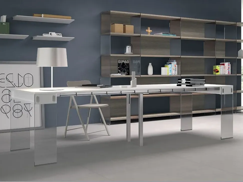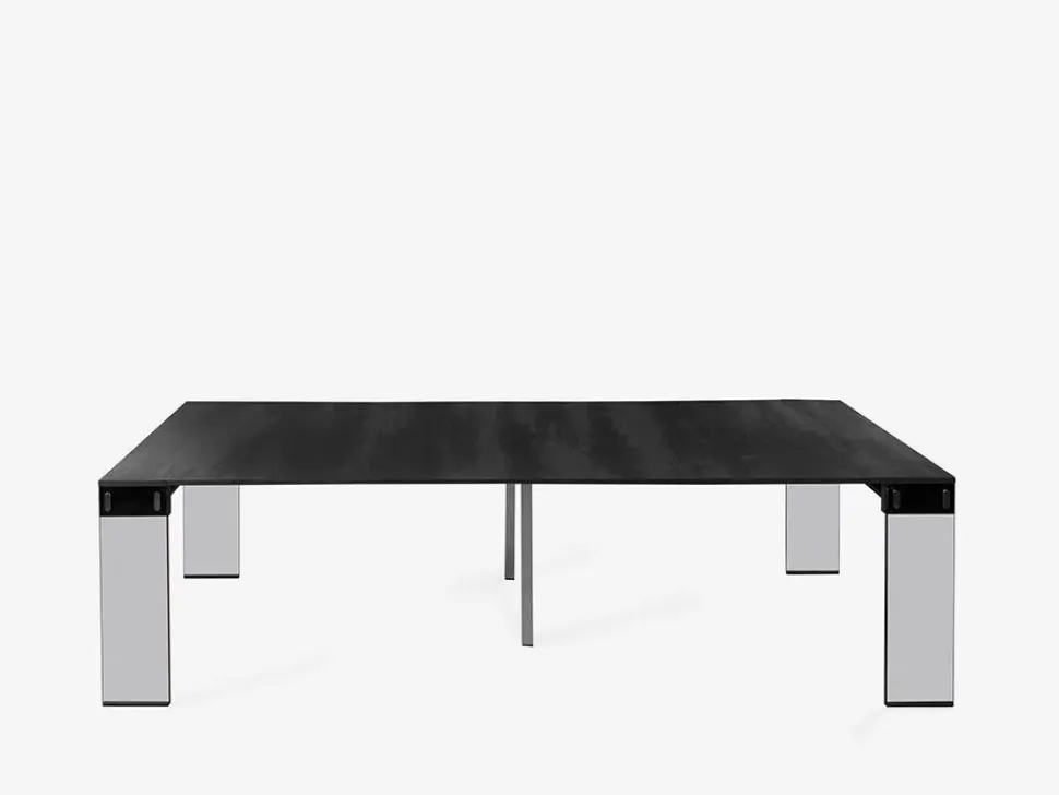 Tavolo-Consolle, City di Pezzani, allungabile ha i fianchi in cristallo temperato nello spessore 10 mm si può schiere trasparente oppure fumé; mentre per una maggiore resistenza è fornita di una gambe pieghevoli in acciaio inox, che scompare quando la consolle è in posizione chiusa. City con un design leggero quasi sospesa e soprattutto le sue misure ridotte sta dappertutto e ottima nei monolocali. La Consolle, nella versione tavolo, con le 4 allunghe da 45 cm può ospitare fino a dieci persone comodi che si appoggiano sulla guida estensibile in alluminio.