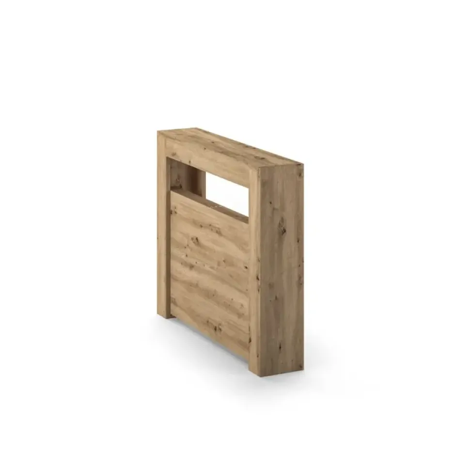 Consolle allungabile con meccanismo in alluminio. Struttura, piano e 3 allunghe (19 mm) in eco legno. Allunghe contenute nella struttura. Consolle con ingombro minimo di soli 18 cm.