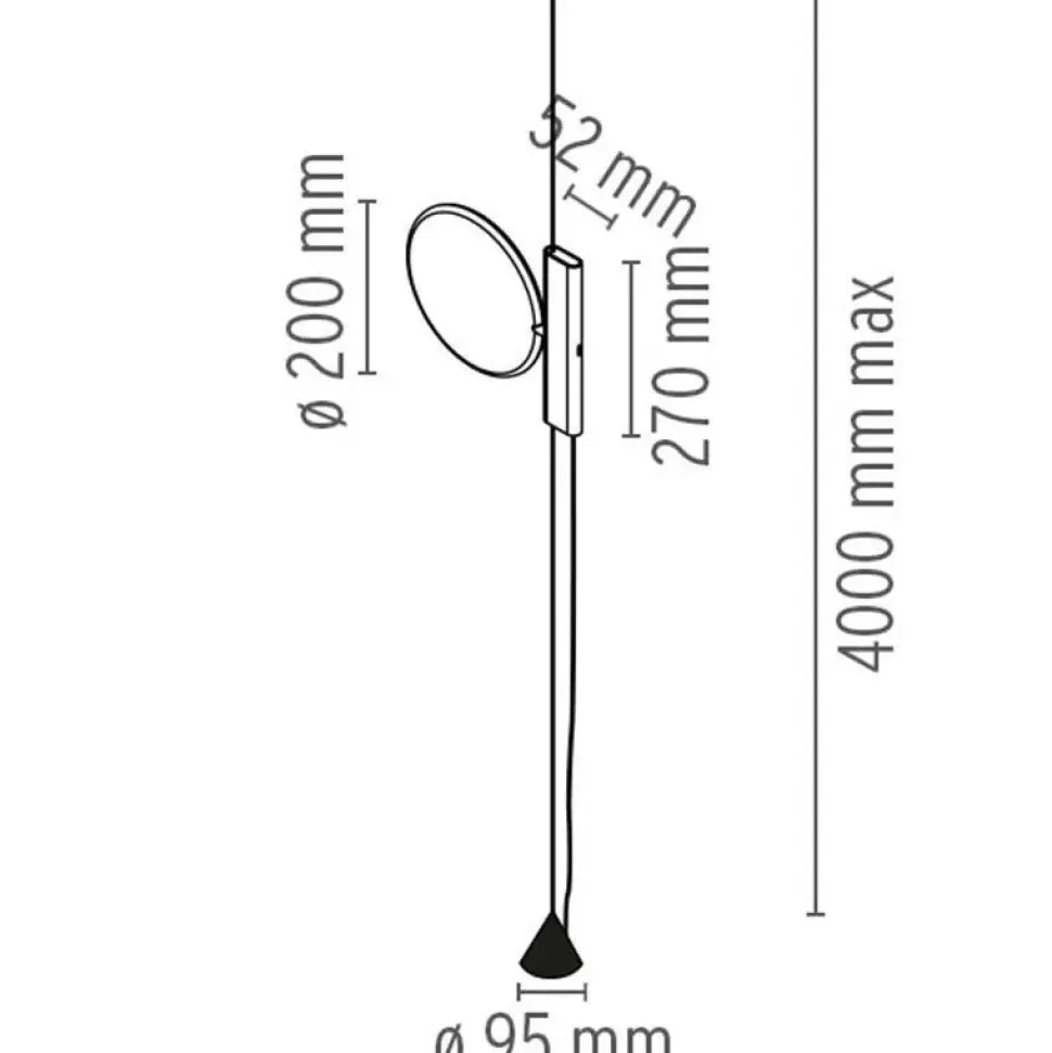 Apparecchio di illuminazione a luce diretta. Testa in alluminio pressofuso verniciato lucido o cromato. Corpo in PA66+30%FV stampato ad iniezione con cover in alluminio estruso verniciato lucido o cromato. Testa orientabile. Il movimento verticale del corpo illuminante è ottenuto mediante lo scorrimento della struttura interna del corpo su un cavetto di acciaio teso tra il plafone e il pavimento (lunghezza utile 4000mm). Interruttore dimmerabile con tecnologia Soft Touch. Alimentatore su spina con plug intercambiabili.