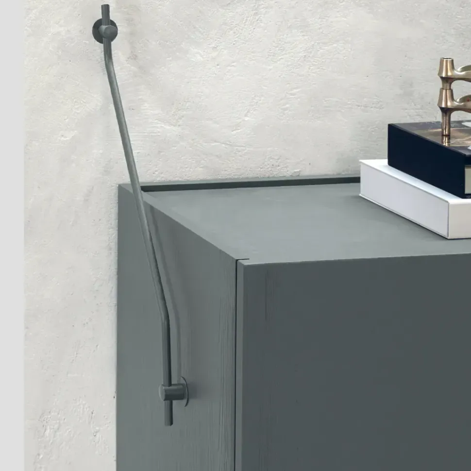 Credenza sospesa a 4 porte con ripiani interni regolabili, realizzata in legno stratificato laccato e legno massello di Conifera lavorato a mano.