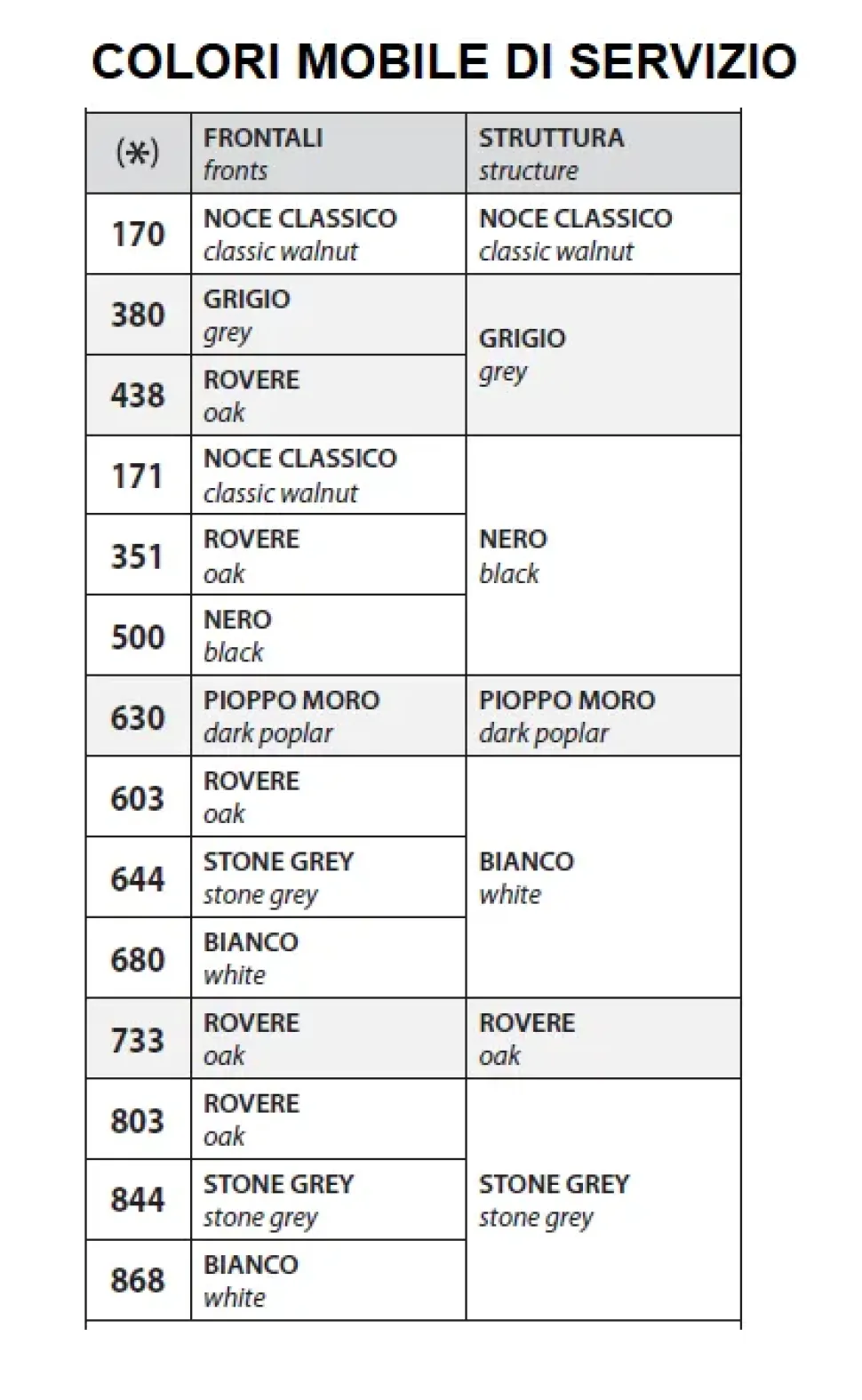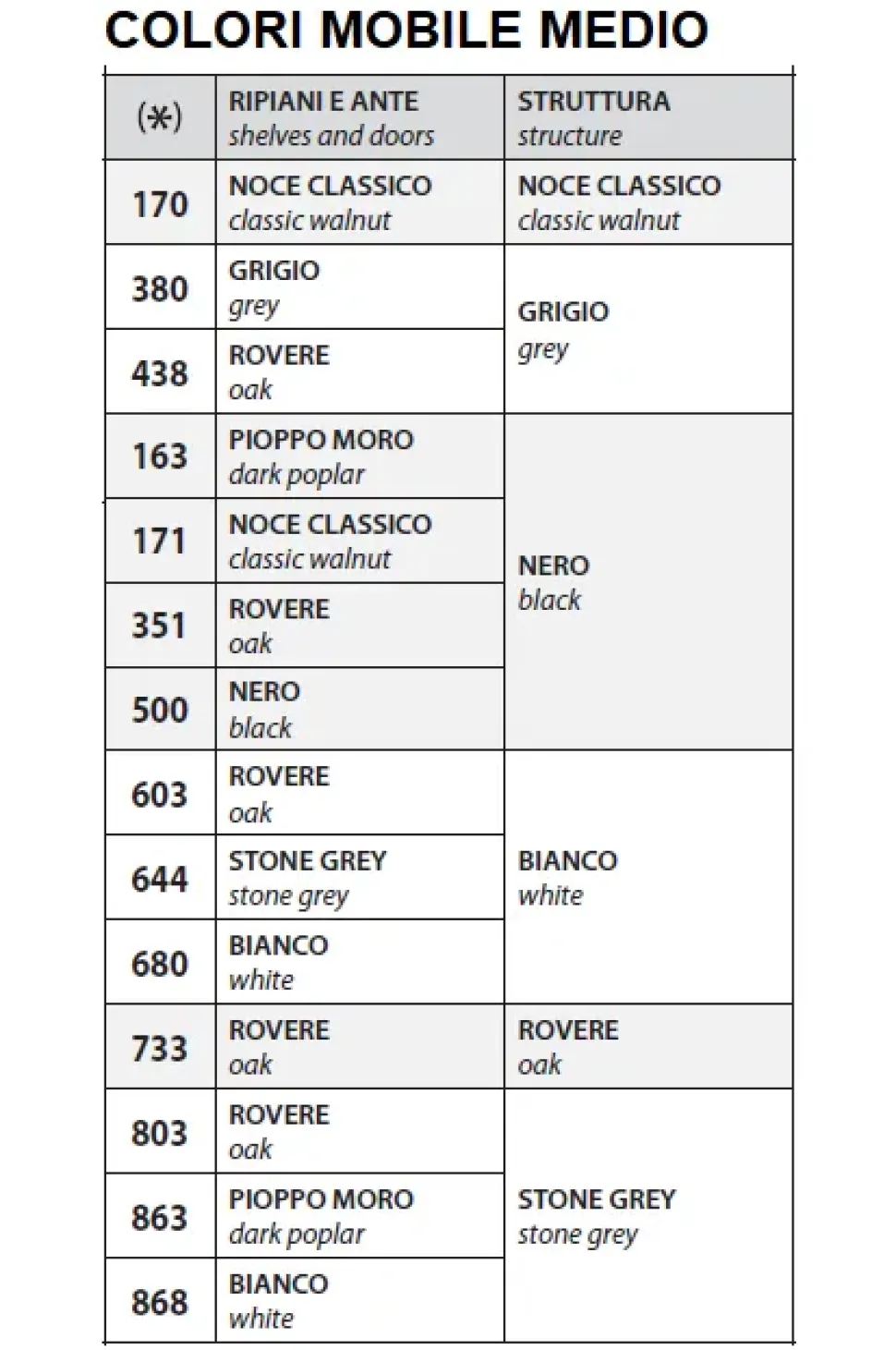 Colori struttura: NOCE CLASSICO, GRIGIO, NERO, ROVERE, STONE GREY.