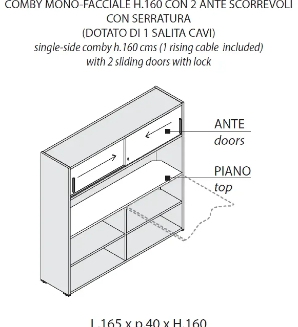 Dotato di 4 scomparti + ripiano a vista con apertura per passaggio cavi.