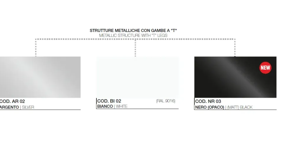 Gambe metallica a T squadrata (v. immagini per dettaglio), con piedini livellatori.