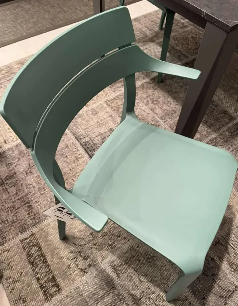 Sedia con braccioli corti impilabile con struttura integrale in polipropilene e fibra di vetro riciclato e riciclabile. Finitura verde. Come da foto.