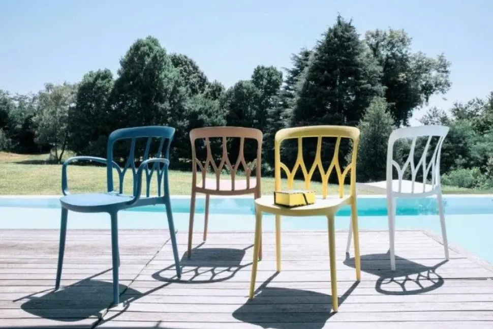 Sedia impilabile con braccioli, struttura integrale in polipropilene e fibra di vetro riciclabile.