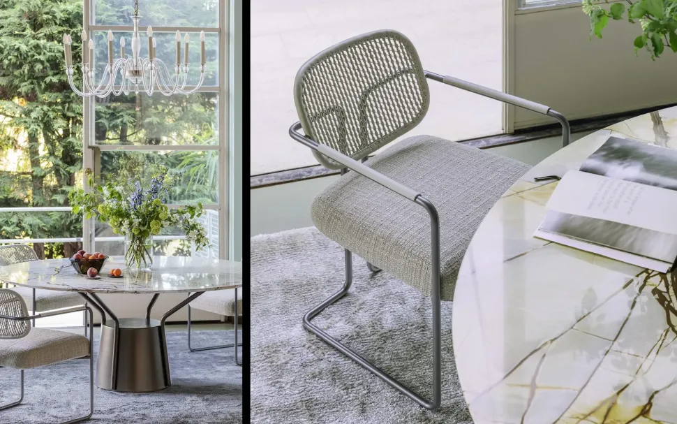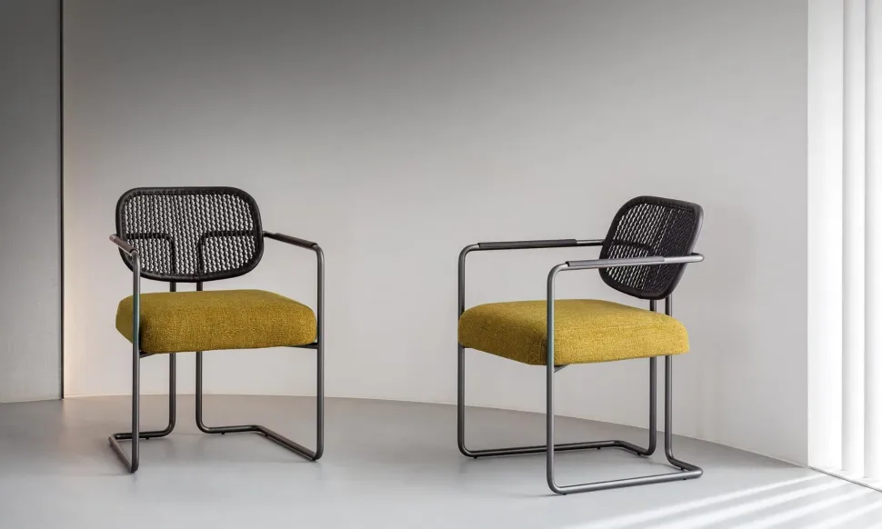 La poltroncina Arno abbina alla struttura in metallo curvato essenziale e leggera la ricchezza esclusiva della pelle intrecciata e traforata dello schienale