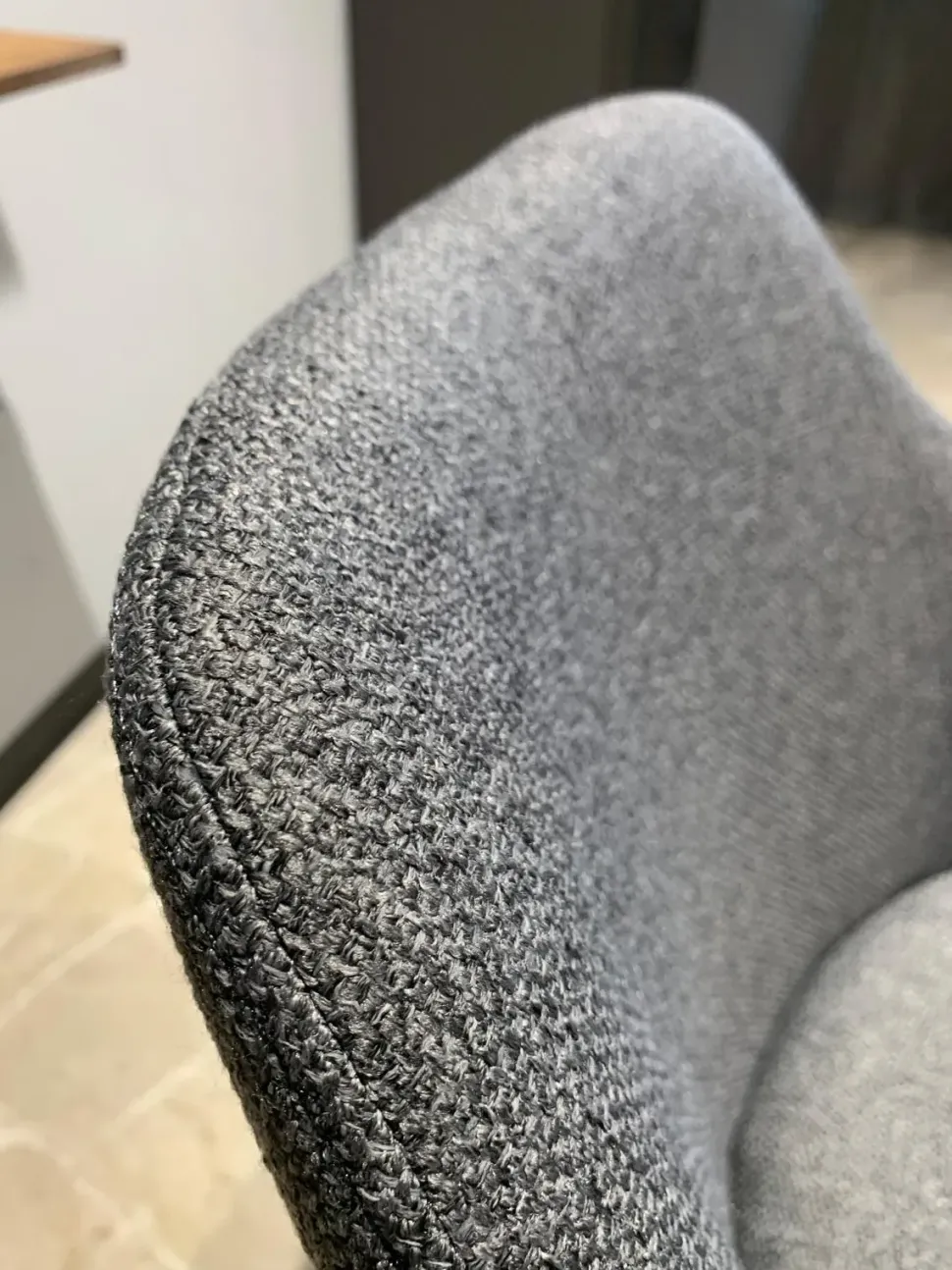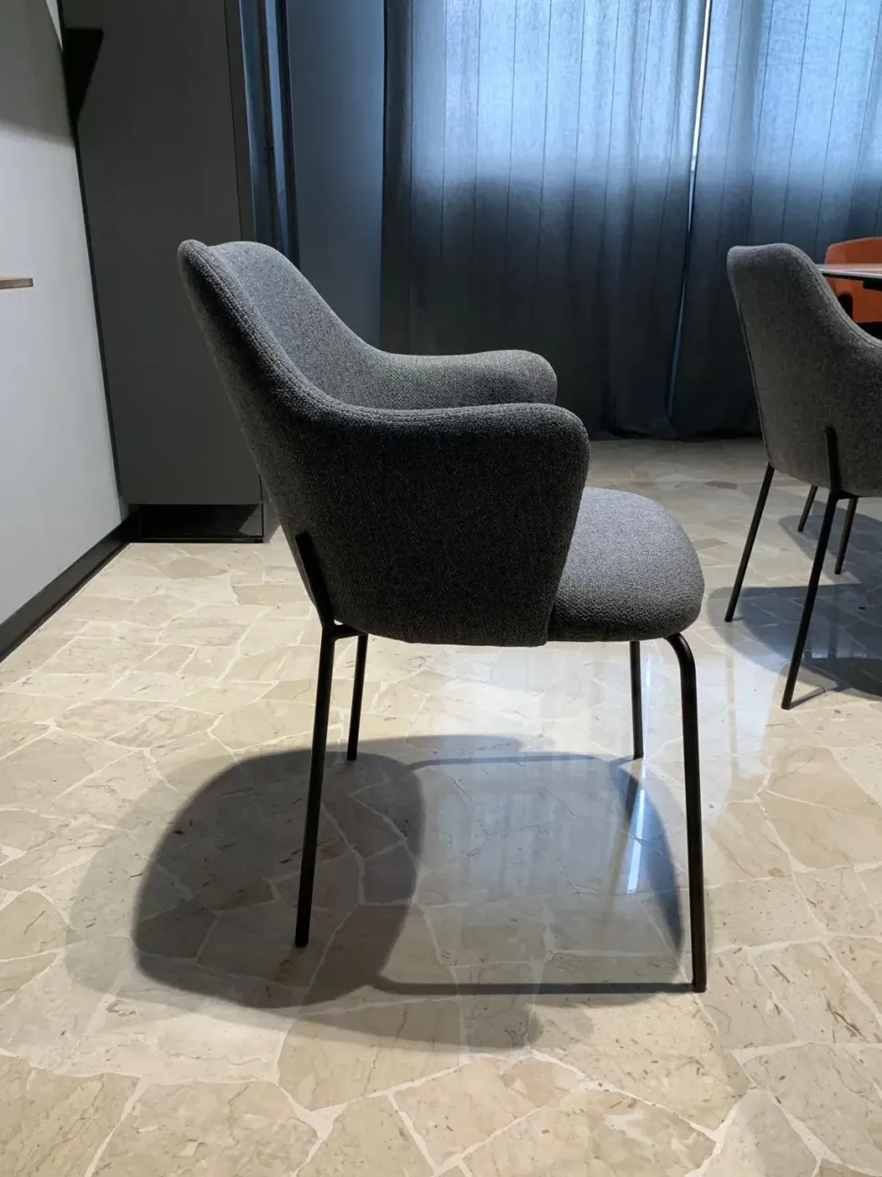 Poltroncina con braccioli, struttura grafite, rivestita in tessuto grigio.