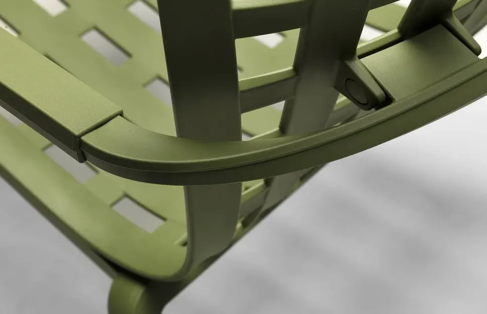 Poltrona reclinabile. Materiale: polipropilene fiberglass trattato anti-UV e colorato in massa. Finitura opaca. Dotata di piedini antiscivolo. Cuscino disponibile su ordinazione. Resina riciclabile.