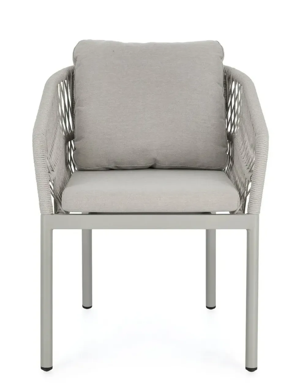 STRUTTURA IN ALLUMINIO VERNICIATA A POLVERE (POLIESTERE). INTRECCIO PER ESTERNO IN CORDA POLIESTERE. CUSCINI SFODERABILI IN TESSUTO IDROREPELLENTE 100% POLIESTERE. IMPILABILE. Misure: Larghezza 62 cm, profondità 66 cm, altezza 78 cm.