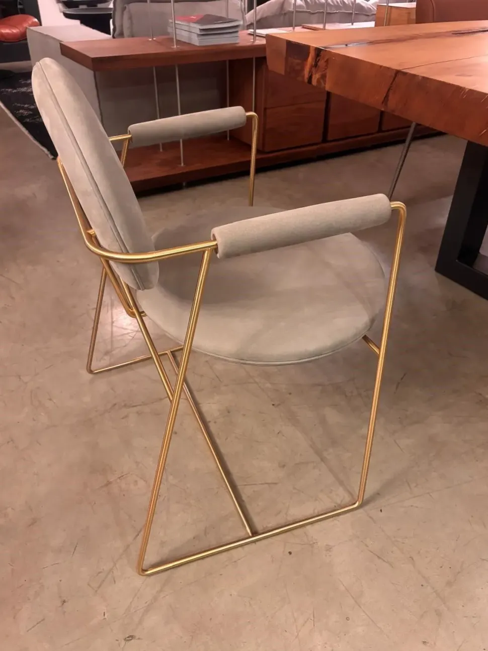 Rivestimento pelle Nabuck Light Grey, struttura in metallo ottonato satinato. Dimensioni: 66×60 h 83 cm. Quantità disponibile: 8 pz
