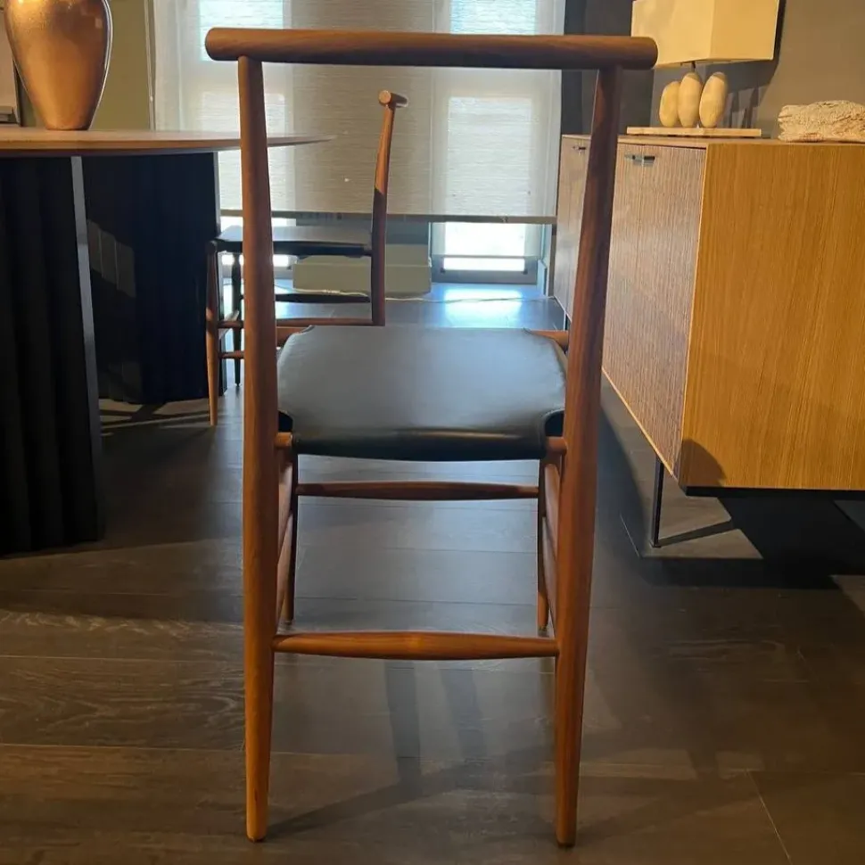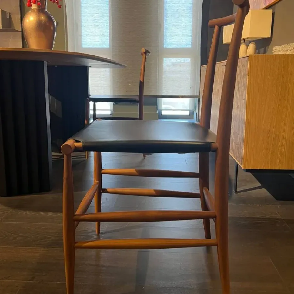 Seduta in cuoio teso a cinghie col. nero e struttura in legno noce canaletto.