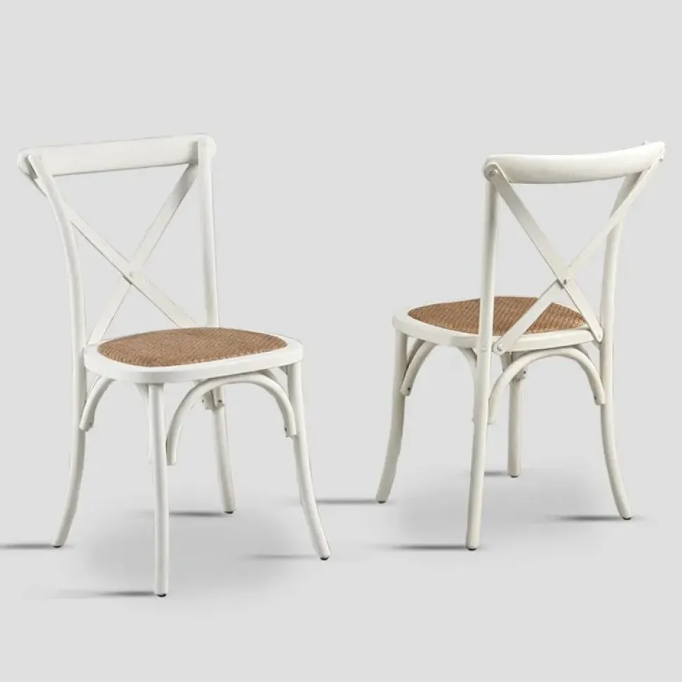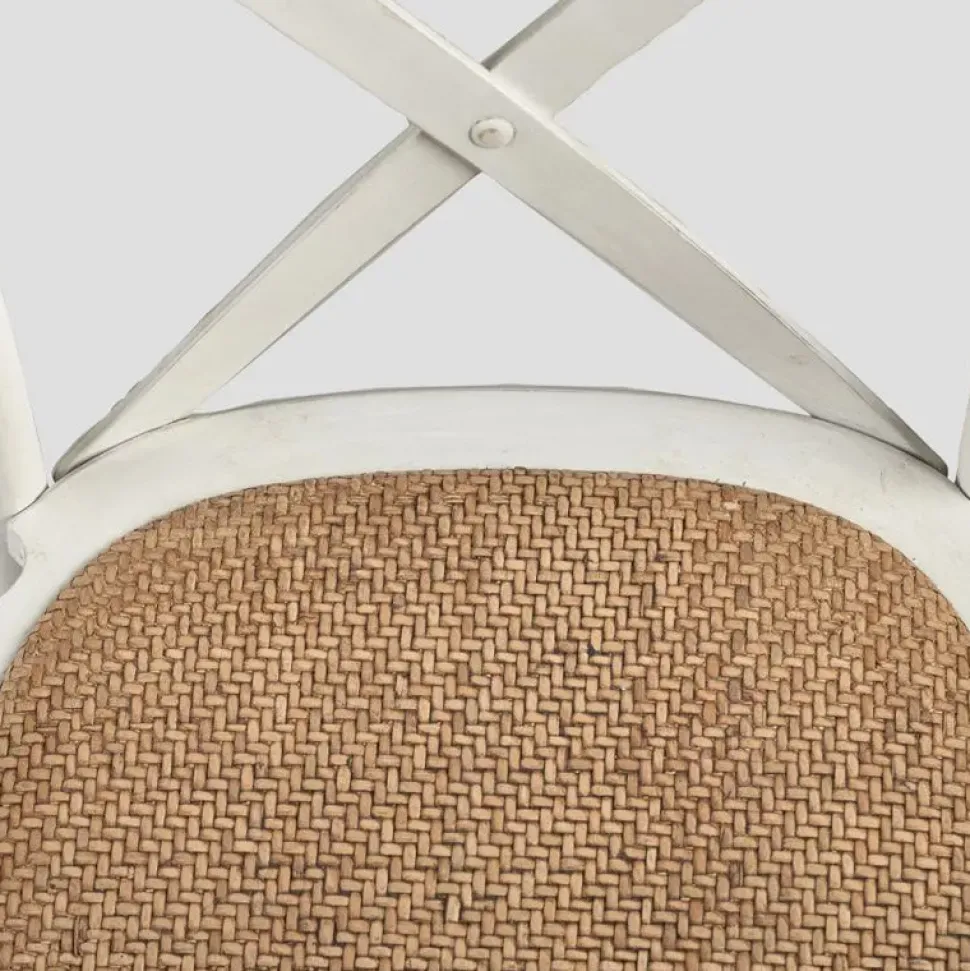 Sedia impilabile in legno massello laccata color White Vintage con schienale incrociato e seduta in cannettato intrecciato. Lavorata a mano. Dimensioni: 89 x 51 x 53 cm disponibilità 8 sedie