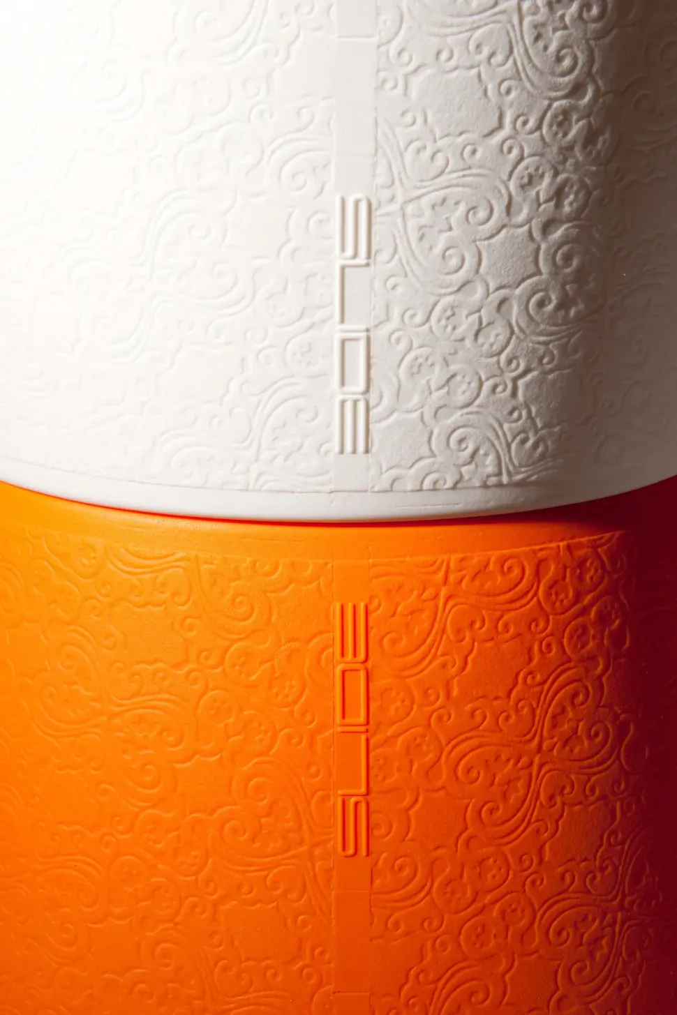 Sgabello ALI BABA STOOL, realizzato in polietilene impreziosito dalla particolare texture: il decoro raffinato, elegante e piacevole al tatto rimanda ai tessuti broccati dell Antico Oriente.