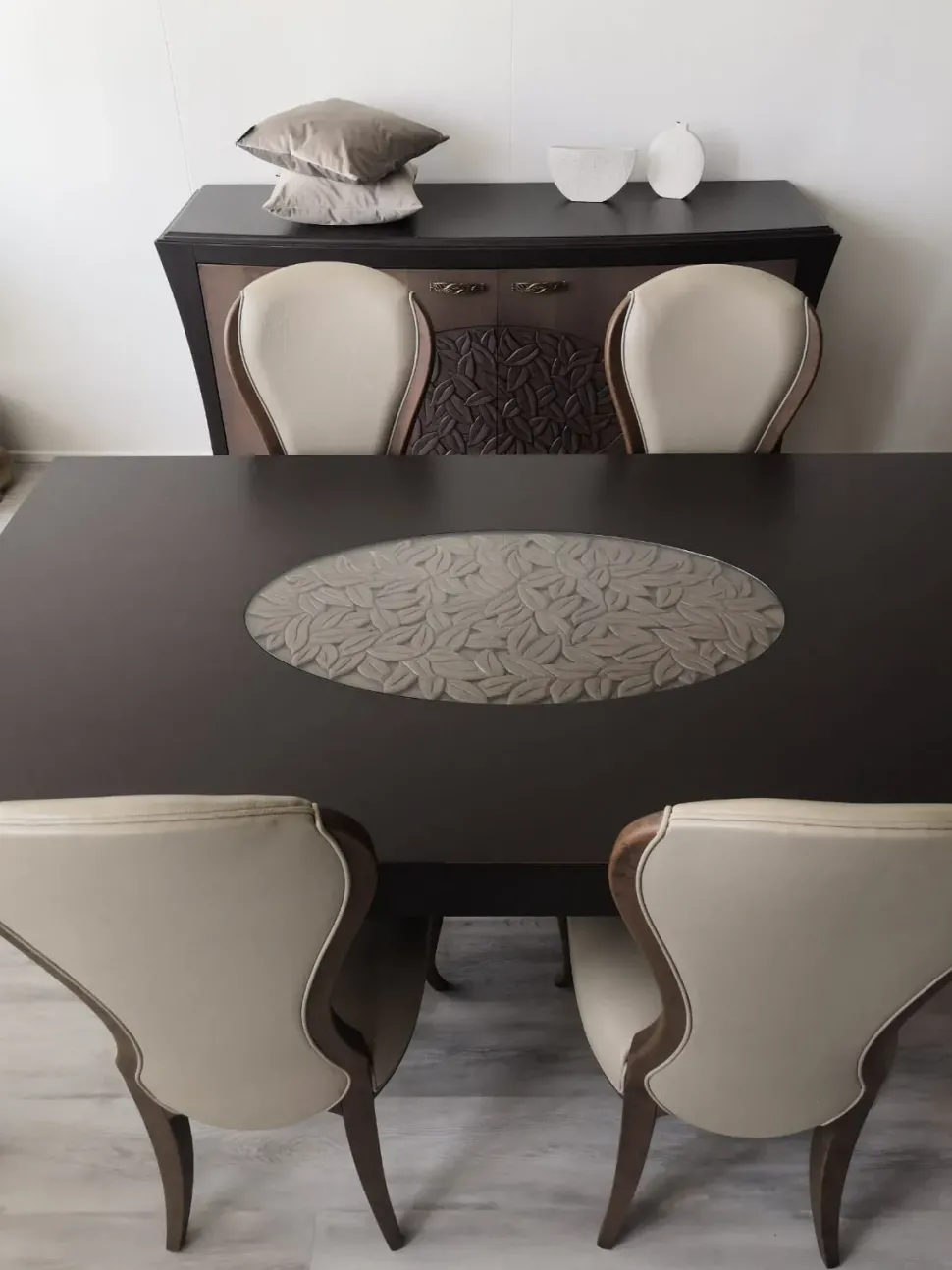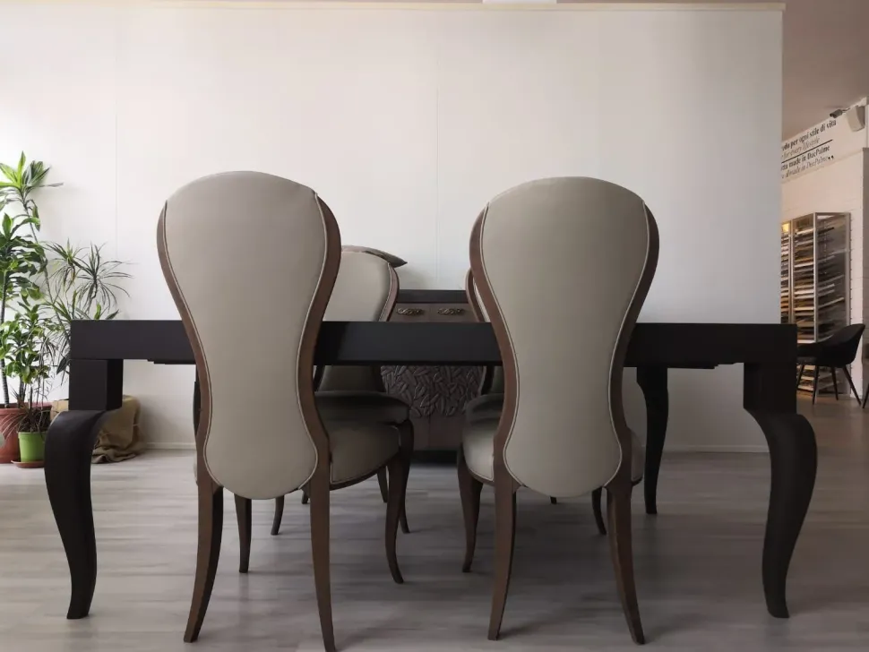 Sala completa della ditta Arkeos composto da una credenza a 2 ante con intaglio con le misure 185 cm – h 96 cm – prof 62 cm, da un tavolo rettangolare con misure 198 cm prof 121 cm allungato a 298 cm e 4 sedie in pelle categoria premium con gambe e cornice in legno…