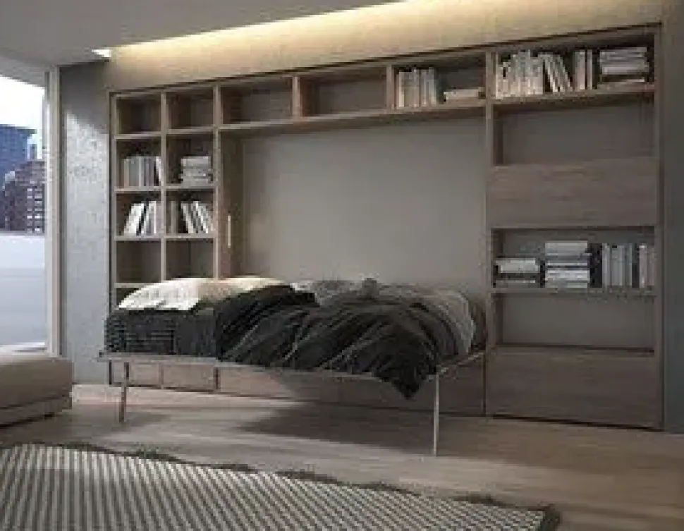 Mobile componibile soggiorno di ” LINEA IN ARREDAMENTI “,affascinante e funzionale nello stesso tempo che consente di poter disporre con dei semplici movimenti di letti matrimoniali, singoli,francesi,castello singolo e doppio,divani e librerie riducendo al minimo l’ingombro quando sono chiusi e assicurando la massima comodità durante la notte. Sistema trasformabile con letto matrimoniale,apertura manuale abbattibile orizzontalmente,pronto all’uso. E’ possibile acquistare separatamente i vari pezzi della composizione secondo le varie esigenze. E’ possibile aggiungere alla composizione: – armadi,tavoli estraibili,divani,poltrone,pouff,sedie, ecc. – luci di lettura interno letto a incasso con accensione indipendente. – testata per letto imbottita e rivestita in tessuto vs.scelta. – scegliere colori di finitura diversi E’ possibile modificare la composizione con: – letto singolo L. cm 85,letto 1 piazza e mezza L. cm 110,letto francese L. cm 140 – apertura e chiusura letto elettrica con telecomando Wireless – realizzazione anche “su misura” per librerie, armadi, mensole, scrivanie Scheda informativa del prodotto – nobilitato melaminico Classe E 1 – schienali letto e librerie,finitura: Grigio – struttura,ripiani librerie,cassettoni, 1 pannello letto chiuso,finitura:Rovere naturale – pannello inferiore letto chiuso, finitura:Sabbia – maniglie inox satinato La composizione comprende: – modulo a ponte con librerie a giorno,cassettoni e pensile orizzontale con anta L. cm 412 x P. 34 x H.236,8 – letto trasformabile matrimoniale apertura ORIZZONTALE chiuso L. cm 212 x P.33 (aperto Lunghezza cm 183 x Larghezza 170) completo di: rete ortopedica apertura in Orizzontale con struttura in metallo verniciato a fuoco e pianale con doghe in legno faggio con apertura/chiusura manuale – fasce elastiche ferma materasso regolabili con velcro – portata massima KG 200 – misure materasso: L. cm 160 x P. 195 x H. 18 (escluso) – è obbligatorio l’ancoraggio del mobile a parete – (è assolutamente vietato il montaggio su pareti in cartongesso) – misura composizione L. 412 x P.33/183 x H.236,8