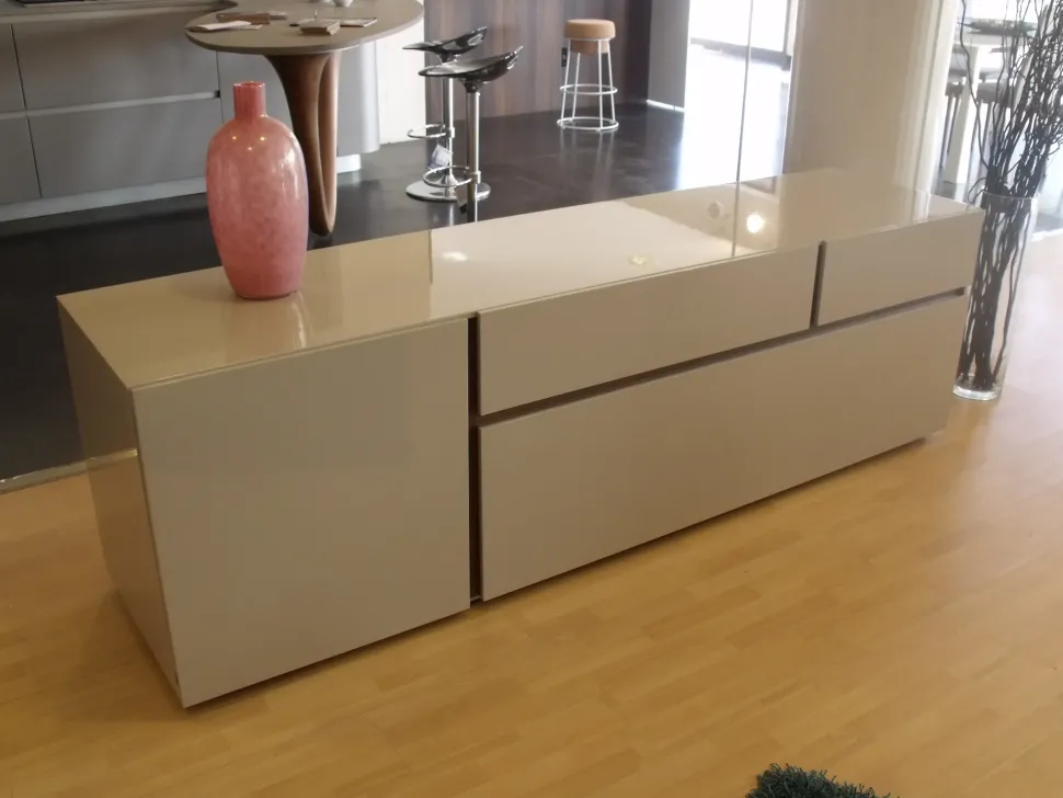 La madia ha un anta a sinistra, due cassetti superiori ed un cestone inferiore con guide ammortizzate, e vassoietto interno scorrevoli porta oggetti in finitura rovere spessart.
