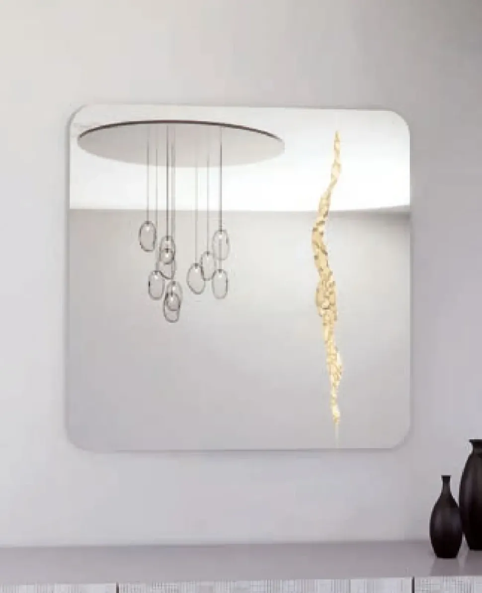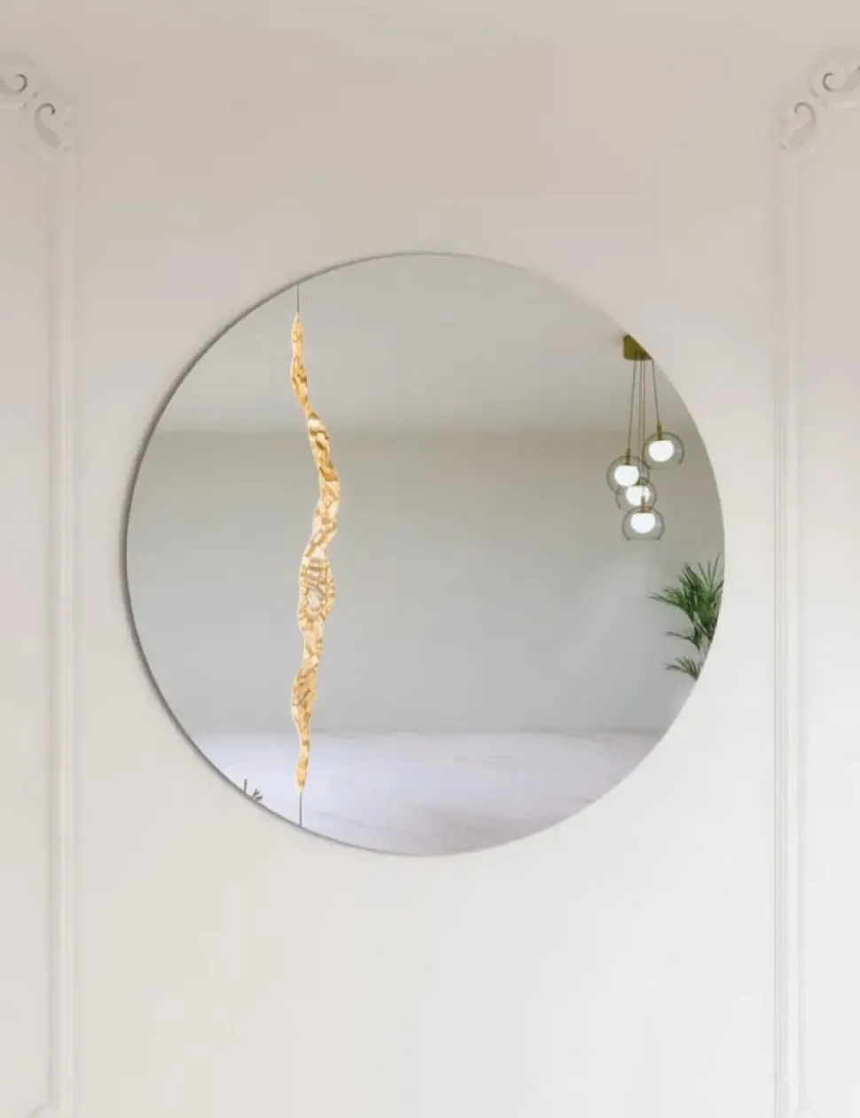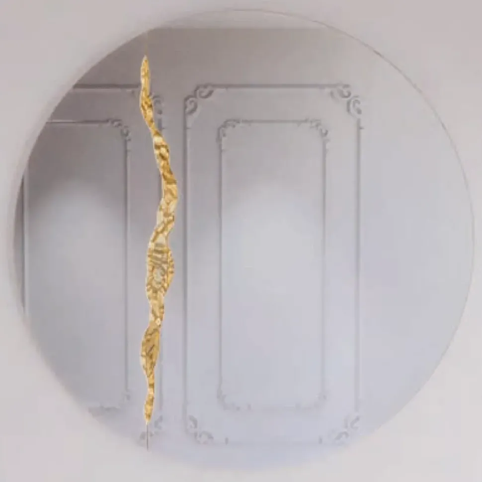 LESION CIRCLE Specchio da parete circolare in cristallo specchiato argento con intaglio bisellato nei due lati e inserto lavorato in secondo livello. Nell inserto luce a led.